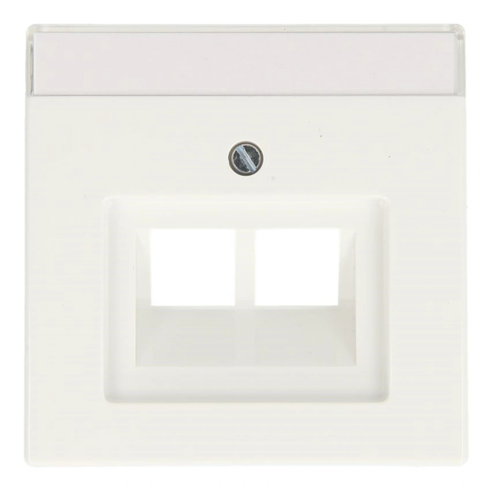 Zentralscheibe mit 2 Schrägauslässen und Beschriftungsfeld als Abdeckung für Netzwerkdosen zur Unterputz-Installation.
