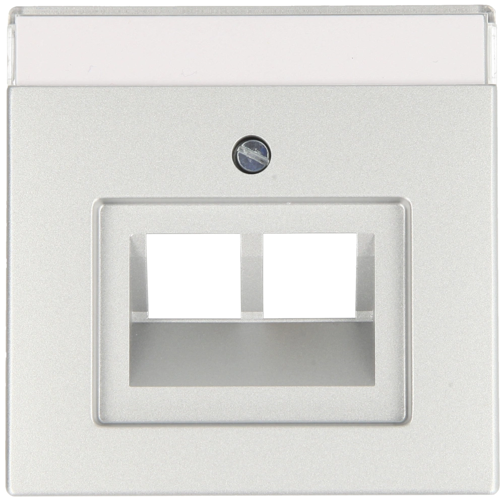 Zentralscheibe mit 2 Schrägauslässen und Beschriftungsfeld als Abdeckung für Netzwerkdosen zur Unterputz-Installation.