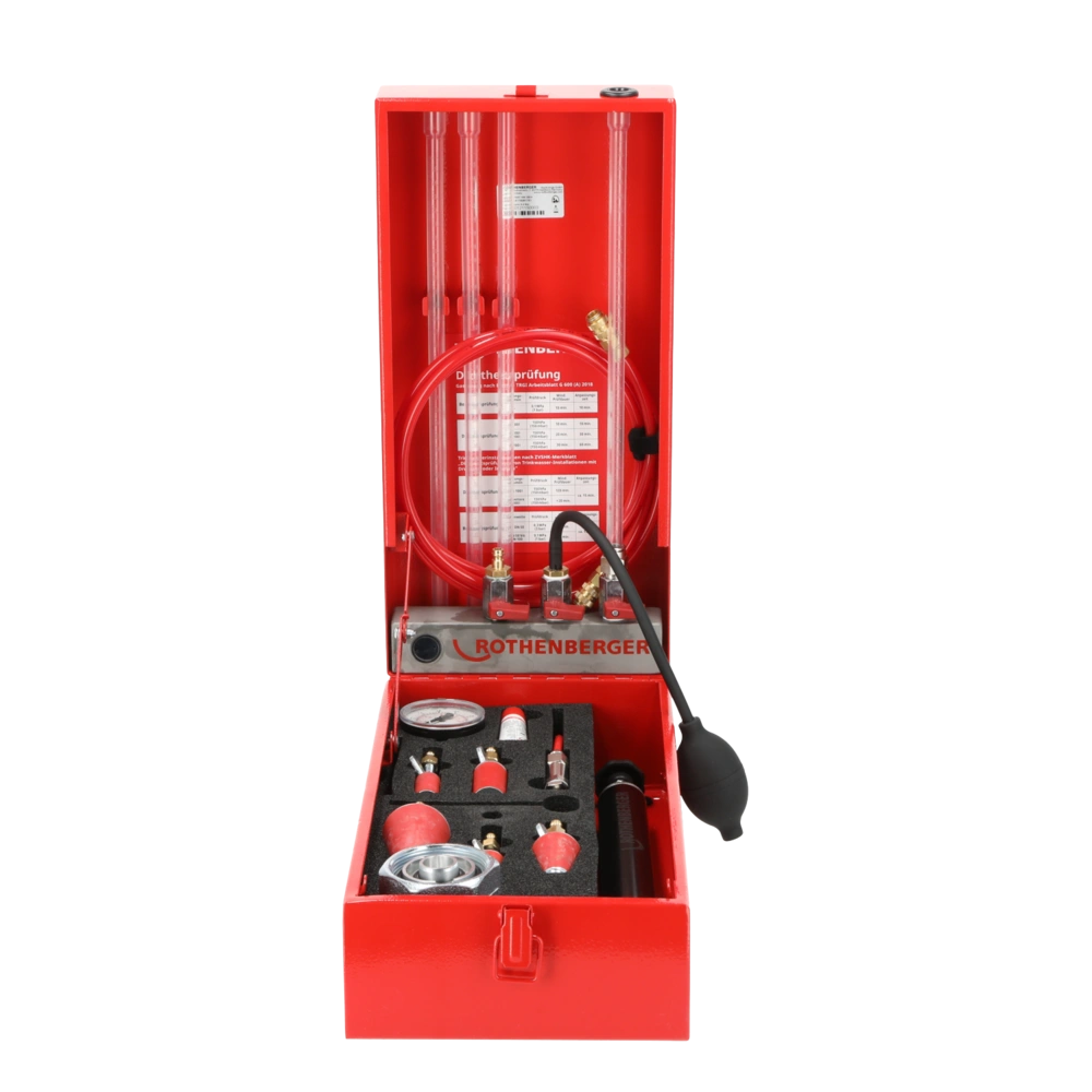 In dem praktischen Stahlblechkasten sind außerdem eine Druckpumpe mit Rückschlagventil und Manometer, 5 Gasprüfstopfen mit Pneumatik-Schnellkupplungen für eine einfache Handhabung sowie weiteres Zubehör untergebracht.