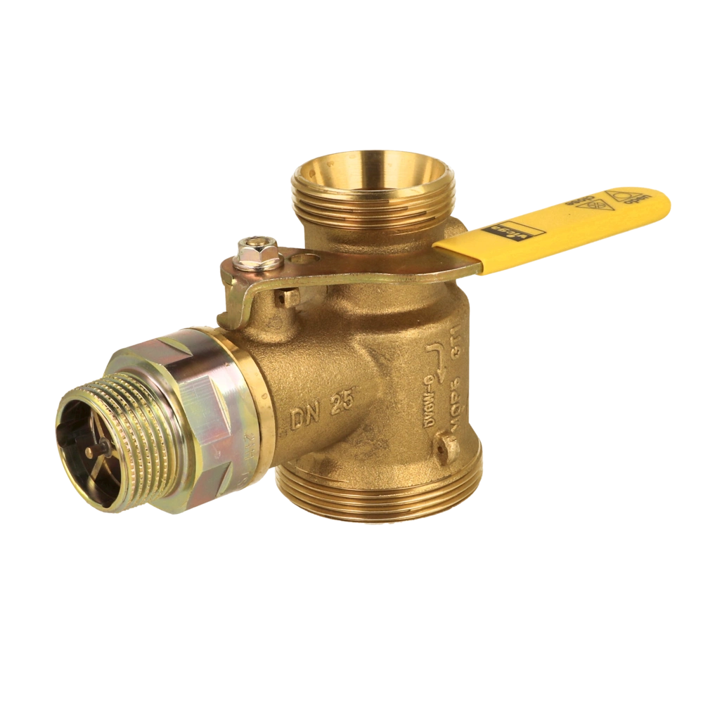 Auf der Ausgangseite kann man die Gaszählerüberwurfmutter plombieren. Durch die Prüfschraube kann der anliegende Gasdruck überprüft werden. Der Kugelhahn ist für 30 Minuten bis zu 650 °C thermisch belastbar.