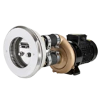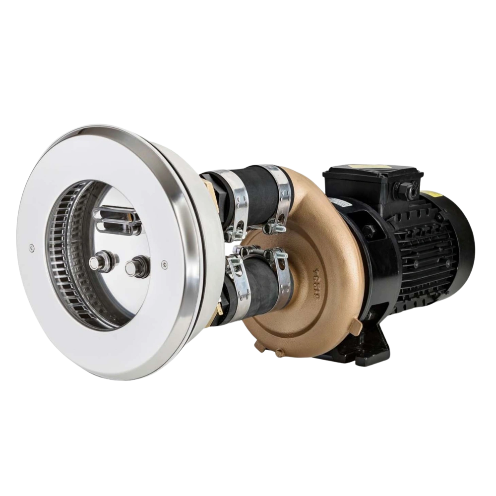 Gegenstromanlage für Betonbecken. Innovative Strömungstechnik mit zwei Düsen übereinander. Die Anlage wird per Druckknopf an der Vorderseite gestartet. Die gleichmäßige Verteilung der Düsenströme ermöglicht natürliche Schwimmbewegungen wie im offenen Wasser. Das Luft-Wasser-Gemisch im Düsenstrom kann eingestellt werden. Die Anlage eignet sich für tägliches Fitnesstraining und leichtes Krafttraining. Das Modell Jet Swim Motion aus Edelstahl mit einem Pumpenkörper aus Bronze wird komplett mit Vormontage- und Fertigbausatz geliefert.