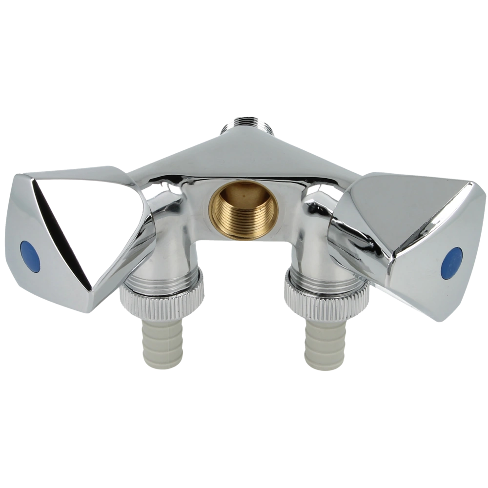 Geräte-Doppelventil 1/2" AG auf 1/2" IG mit zusätzlichen Schlauchverschraubungen zur Erweiterung bestehender Auslaufventile.