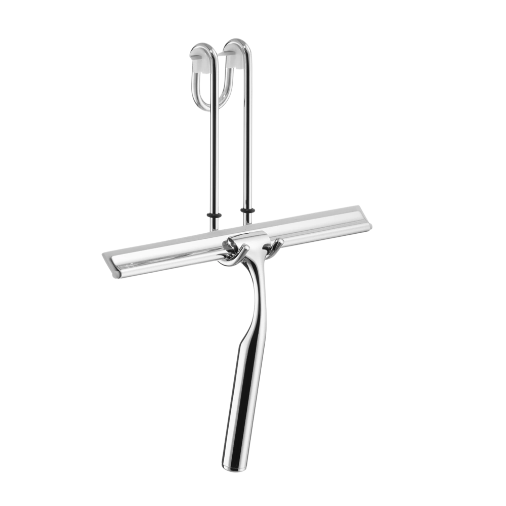 Hochwertiger Glasabzieher mit Halter aus verchromtem Messing zum Einhängen an Duschkabinen. Zum Schutz der Duschabtrennung ist der Halter mit einem Kantenschutz versehen.