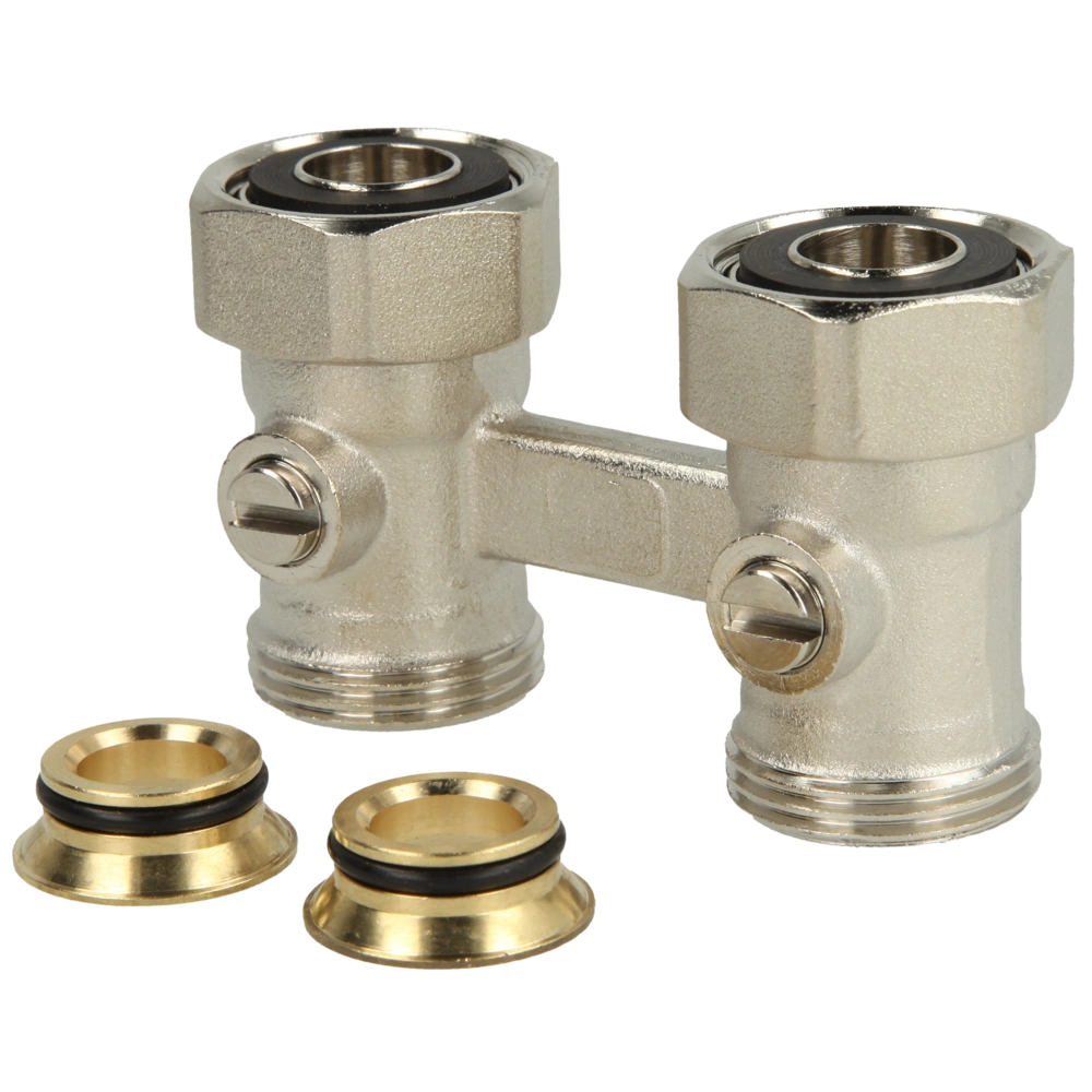 Die Vekotrim Anschlussverschraubung mit Absperrkugelhähnen ist für die Montage an Ventilheizkörpern vorgesehen. Die selbstdichtenden Anschlüsse ermöglichen eine einfache Montage am Heizkörper. Der Vor- und Rücklauf sind separat absperrbar. Der Hahnblock ist für den Links-, Rechts- und Mittelanschluss am Heizkörper einsetzbar.