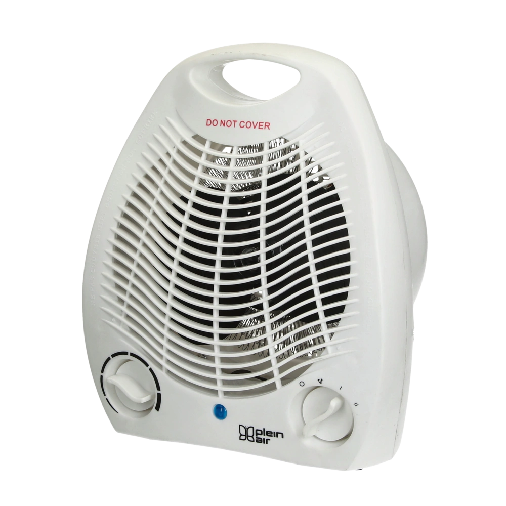 Elektrischer Heizlüfter mit Gebläse, Thermostatfunktion und zwei wählbaren Leistungsstufen. Durch das Thermostat lässt sich der Heizlüfter für den Frostschutz einsetzen.