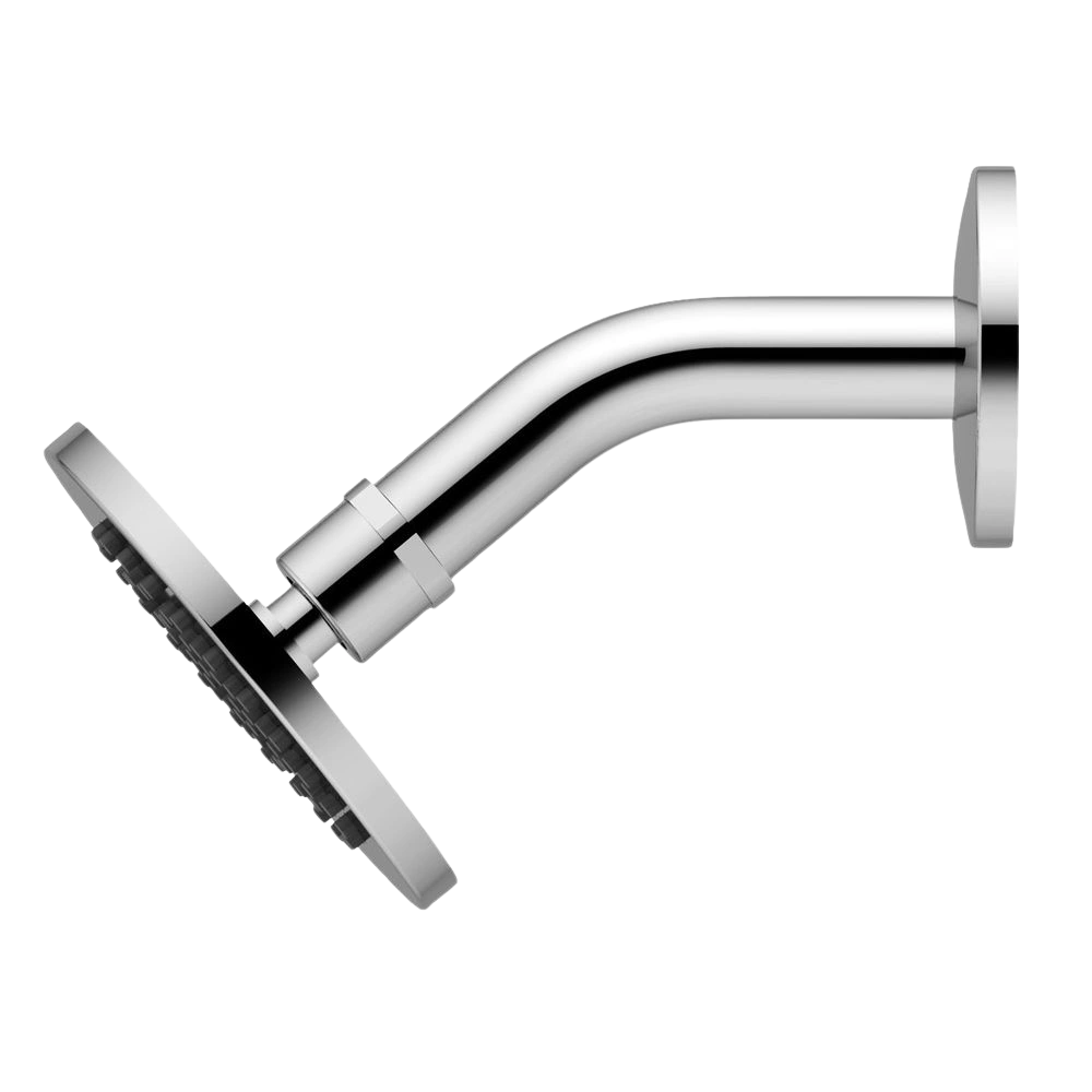 Regenbrause mit gebogenem Wandanschluss und schwenkbarem Kugelgelenk.