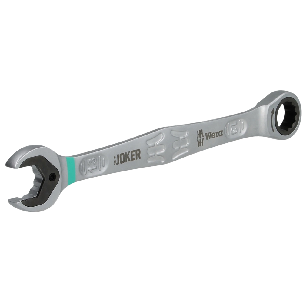 Die Maul-Seite des Schlüssels hat eine integrierte Metallplatte. Mit ihr lassen sich gleich mehrere Probleme lösen, die jeder Handwerker kennt: Um eine Schraube oder Mutter zum Einsatzort in schwer zugänglichen Lagen zu bringen, lässt sie sich bei diesem Schlüssel einfach in das Sechskantfutter auf die Platte legen und - ohne unterwegs verloren zu gehen - zum Gewinde führen. Dort geht es weiter: Mit der Platte als Führung lassen sich Mutter oder Schraube präzise an das Gewinde ansetzen, ohne zu verkanten oder das Gewinde durch schiefen Ansatz zu beschädigen. Die Metallplatte sorgt anschließend dafür, dass der Schlüssel immer bündig auf der Mutter oder Schraube aufsitzt, ohne dass er abrutschen kann. Das ermöglicht schnelleres Arbeiten, höheres Drehmoment und verminderte Verletzungsgefahr bei der Arbeit. Und für den unwahrscheinlichen Fall, dass die Platte beschädigt wird, ist sie sogar auswechselbar. Die doppelte Sechskantgeometrie des Schlüsselmauls ermöglicht einen Rückschwenkwinkel von nur 30°. Das vermeidet lästiges Wenden des Schlüssels in engen Einbausituationen. Am anderen Ende hat der Joker eine Ratsche, die mit der außergewöhnlich hohen Feinverzahnung mit 80 Zähnen auch in engsten Bauräumen effektiven Vortrieb leistet. Alle Joker Schlüssel sind mit dem „Take it easy“-System ausgestattet. Jede Größe hat eine eigene Farbmarkierung. So ist jeder Schlüssel schnell zur Hand.