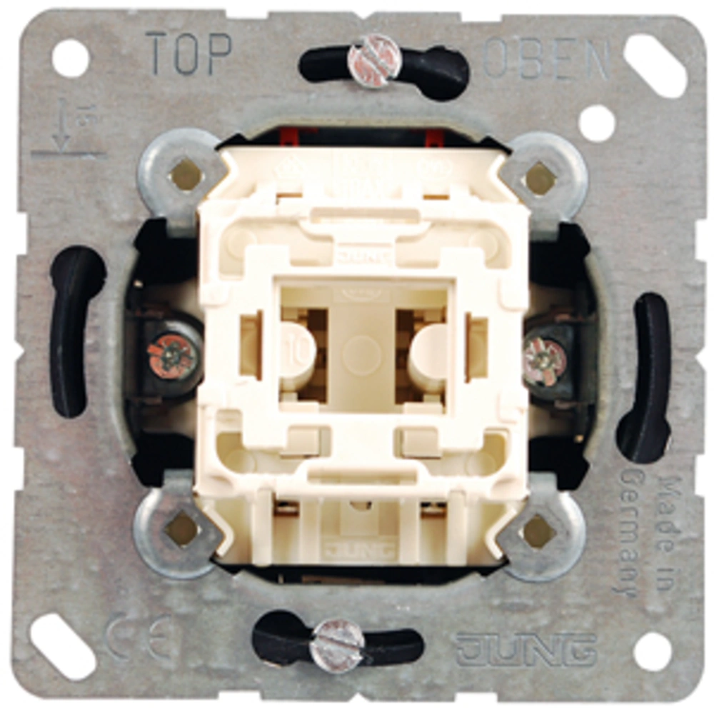 Kreuz-Wippschalter-Einsatz zur Unterputz-Installation mit Federklemmen für den werkzeuglosen Kabelanschluss.