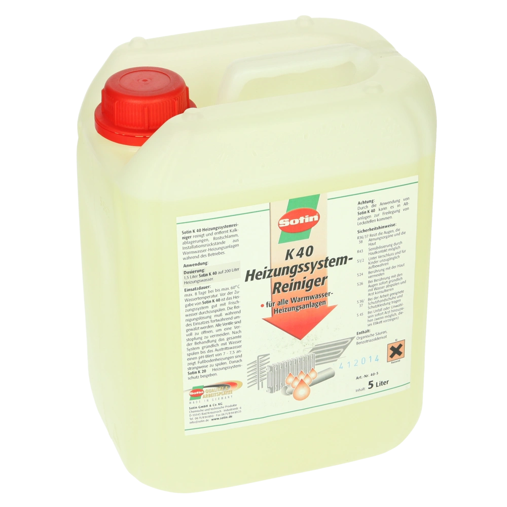 Alle ProduktinformationenReiniger für Heizungsanlagen. Entfernt im laufenden Betrieb schonend Rostschlamm, Härteablagerungen und Installationsrückstände. Der Reiniger ist geeignet für alle zugelassenen Werkstoffe. Ca. 1,5 l auf 200 l Heizwasser lösen innerhalb von 14 Tagen Korrosions- und Härteablagerungen in feinsten Partikeln ab. K 40 Heizungsreiniger dient auch zur Vorbereitung für einen nachfolgenden Heizungsschutz mit Sotin K 20.
