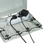 Die Kabelsafebox bietet hervorragenden Schutz für Steckdosenleisten, Ladegeräte, Verlängerungen und Adapter. Sie ist ideal geeignet für Weihnachtsbeleuchtung, Gartenpumpen, auf der Baustelle oder im Campingbereich. Sie bietet dauerhaften Schutz im Außenbereich und ist auch für die Wandmontage einsetzbar. Jeder Eingang verfügt über eine separat nutzbare Zugentlastung.
