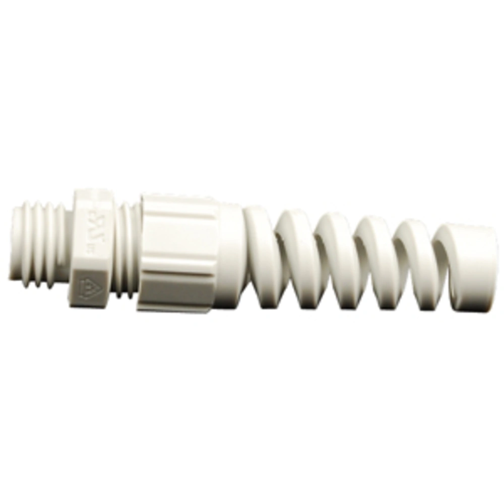 Kabelverschraubung mit Biegeschutz zum Verbinden eines Kabels an elektrotechnischen Geräten und Maschinen, die im Normalgebrauch bewegt werden. Die angeschlossene Leitung nach VDE 0730 schützt Anschluss und Kabel gegen übermäßige Biegung.