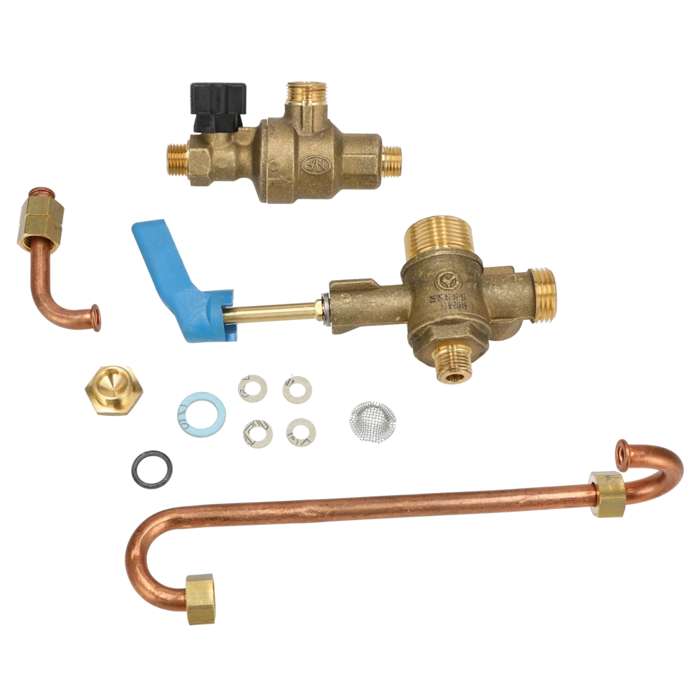 Garnitur als Kaltwasser-Anschlussstück für die Wasserzufuhr bei EGLM- und EGVM-Modellen von e.l.m.leblanc-Heizgeräten. Sie stellt die Verbindung zwischen der Trinkwasserleitung und dem Gerät her, inklusive Absperrarmatur.
