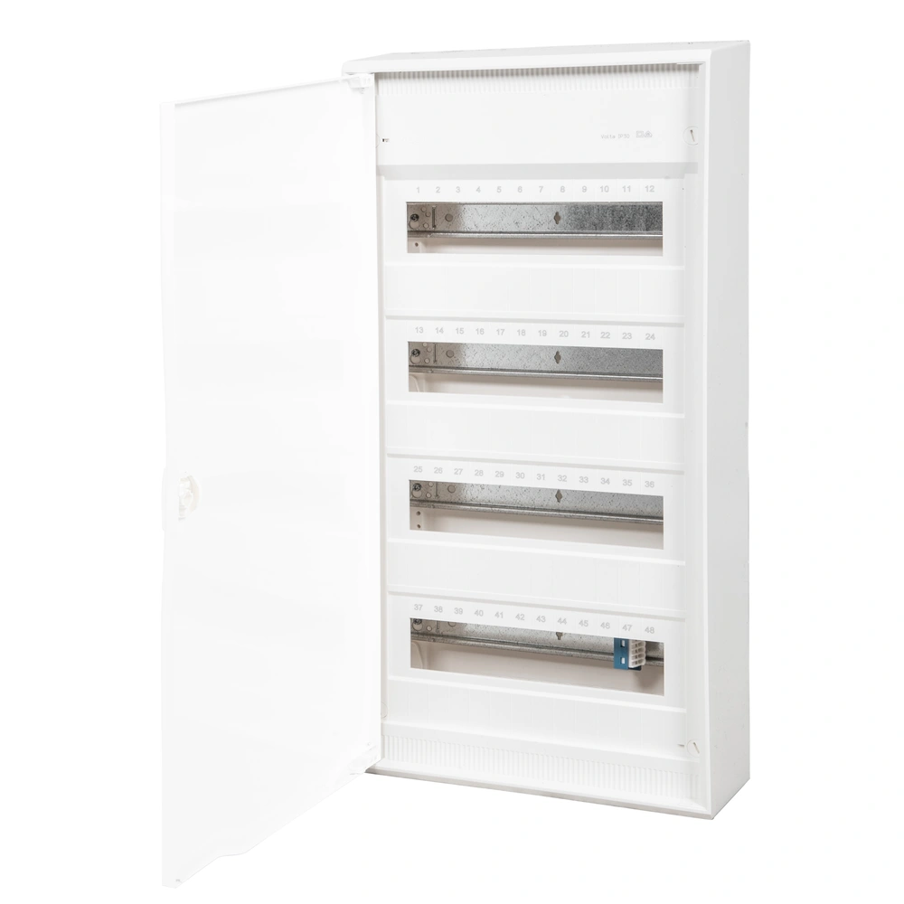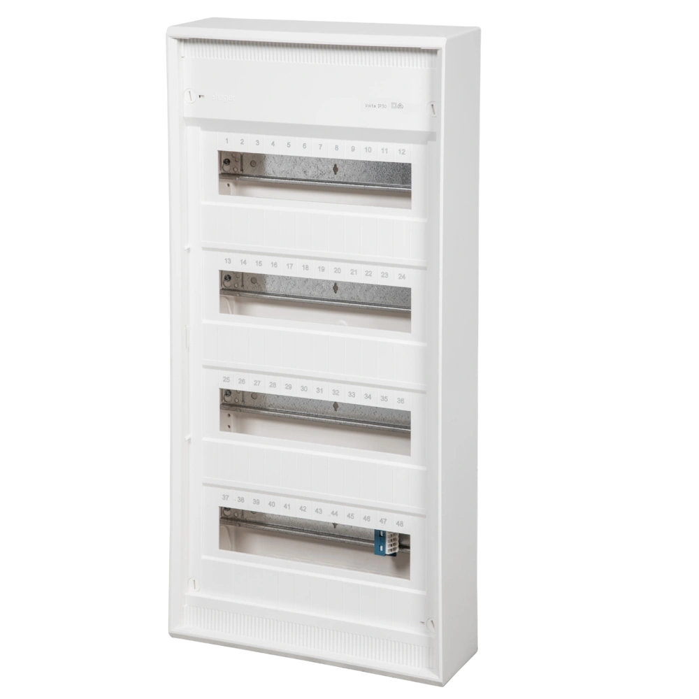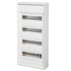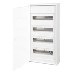 Der Aufputz-Kleinverteiler ist für den Einsatz in Wohngebäuden geeignet. In seine 4 Verteilerreihen lassen sich Geräte mit einer Einbautiefe von 70 mm und bis 63 A / 400 Volt Spannung einsetzen. Der Mauerkasten aus Kunststoff besitzt serienmäßig einen Leitungsabfang und ausbrechbare Leitungseinführungsschieber mit Schnappbefestigung. Der Blendrahmen mit 15 mm Putzausgleich sorgt nach der Montage für einen sauberen Wandabschluss. Die fingersichere QuickConnect-Klemme mit Stecktechnik in montagefreundlicher Schnapptechnik und Klemmen für FI-Schutz-Schalter sorgen für eine einfache Verdrahtung. Die integrierte Wasserwaage erleichtert die Wandmontage.