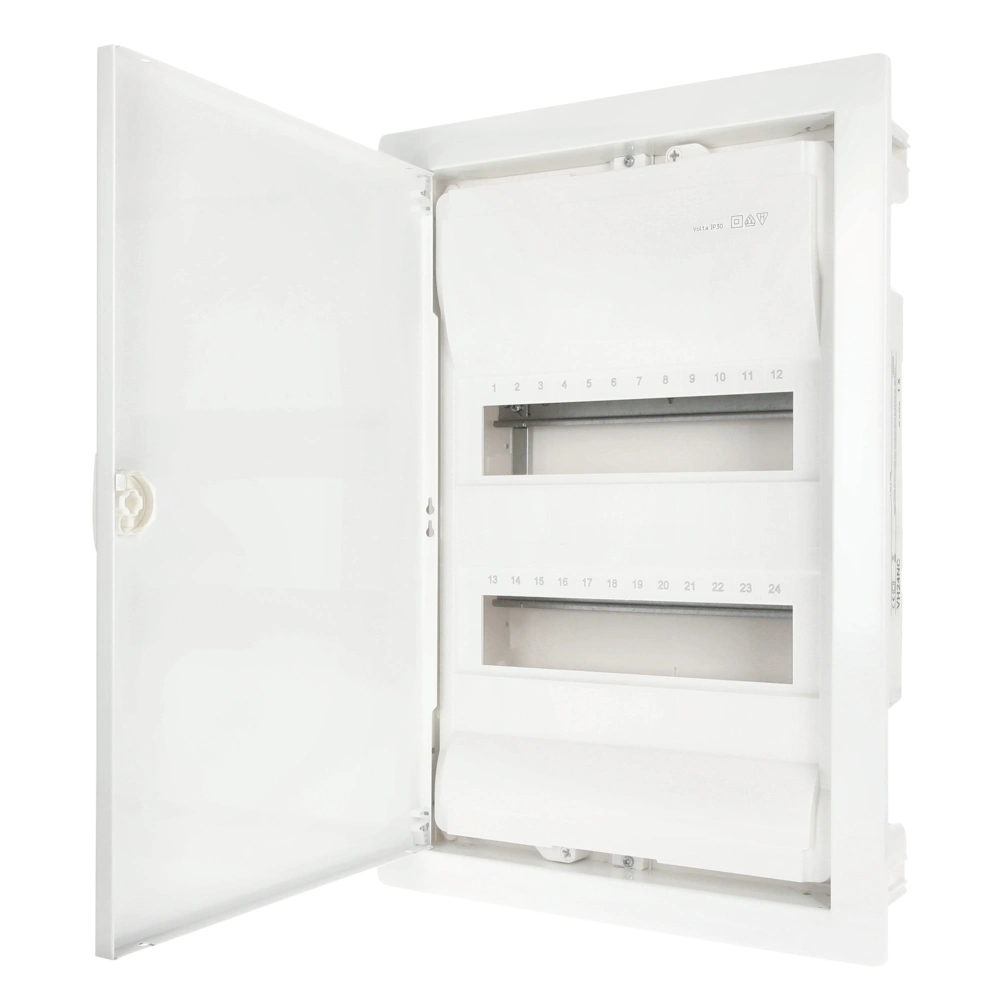Der Hohlwand-Kleinverteiler ist für den Einsatz in Wohngebäuden geeignet. In seine 2 Verteilerreihen lassen sich Geräte mit einer Einbautiefe von 70 mm und bis 63 A / 400 Volt Spannung einsetzen. Der Mauerkasten aus Kunststoff besitzt serienmäßig einen Leitungsabfang und ausbrechbare Leitungseinführungsschieber mit Schnappbefestigung. Der Blendrahmen mit 15 mm Putzausgleich sorgt nach der Montage für einen sauberen Wandabschluss. Der Türanschlag kann rechts oder links gewählt werden. Die fingersichere QuickConnect-Klemme mit Stecktechnik in montagefreundlicher Schnapptechnik und Klemmen für FI-Schutz-Schalter sorgen für eine einfache Verdrahtung. Die integrierte Wasserwaage erleichtert die Wandmontage.