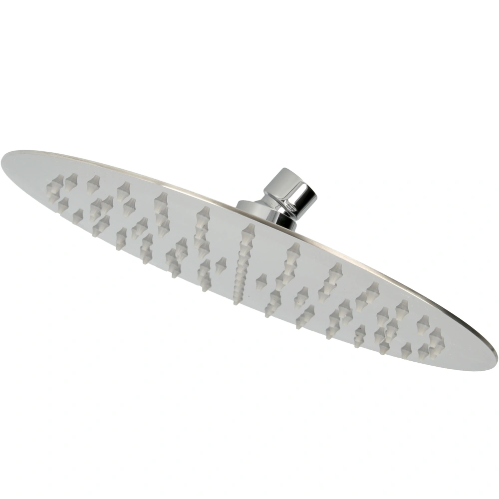 Kopfbrause aus poliertem Edelstahl in moderner, flacher Optik. Durch das Kugelgelenk lässt sich die Kopfbrause in unterschiedliche Richtungen schwenken und individuell anpassen. Antikalknoppen sorgen für eine einfache Reinigung.