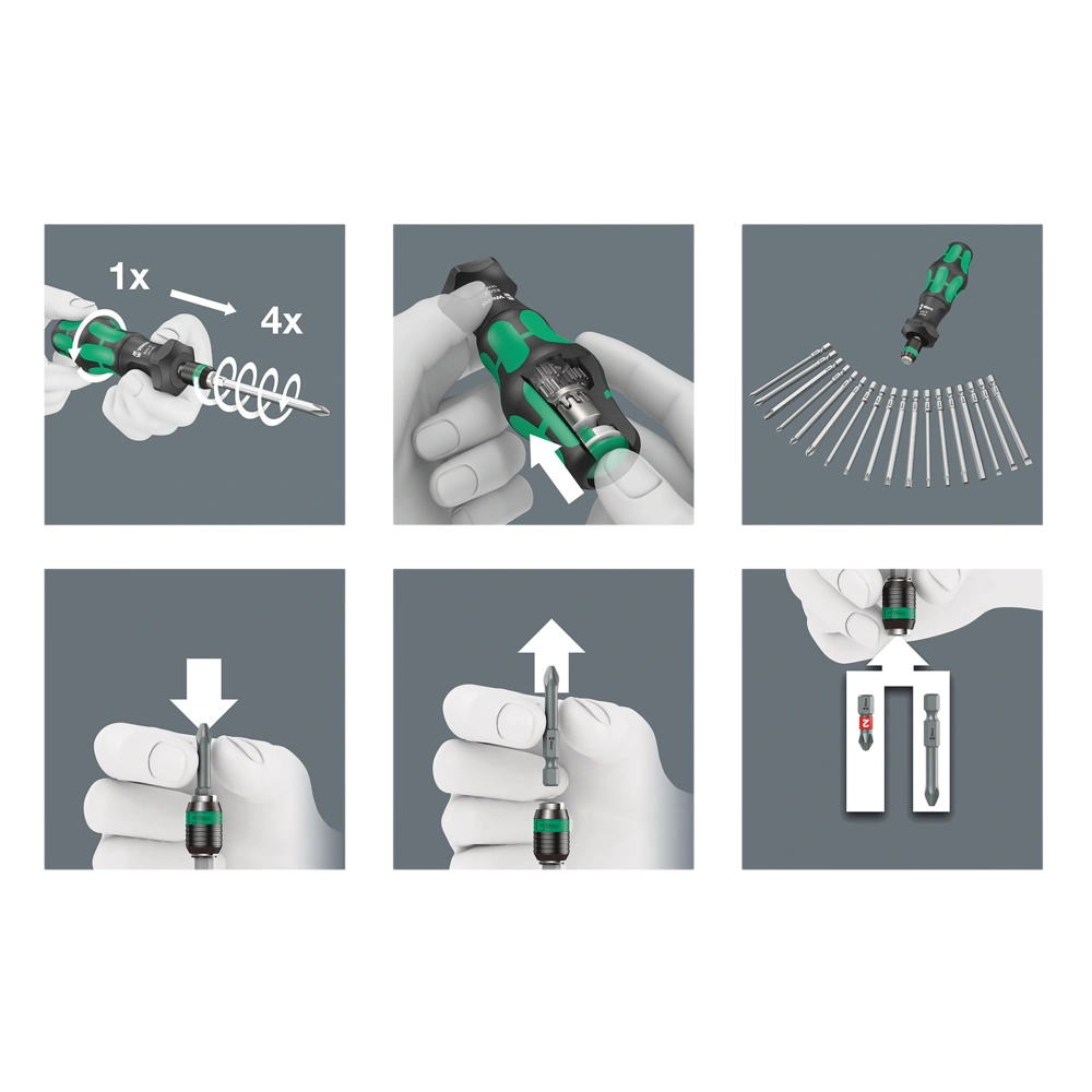 Dieses Werkzeug vervierfacht die Schraubgeschwindigkeit rein mechanisch durch die Übersetzung. Die Aktivierung und Deaktivierung dieser Turbo-Funktion des Planetengetriebes erfolgt durch einfachen Knopfdruck. Mit deaktivierter Übersetzung ermöglicht der Handhalter kraftvolles Verschrauben und einfaches Feinjustieren. Durch den Rapidaptor Bithalter kann der Kraftform Turbo mit allen herkömmlichen 1/4“-Sechskant-Bits für die verschiedensten Schraubprofile eingesetzt werden. Die Bits können direkt eingesetzt werden und halten sicher im Futter. Durch Nach-vorne-schieben der Hülse können sie genauso einfach entnommen werden – alles mit nur einer Hand.