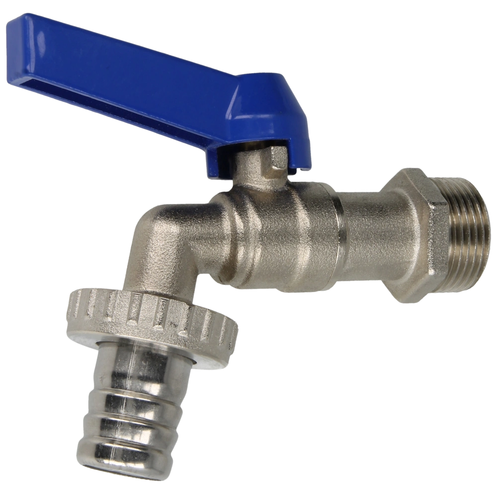 Das Kugelauslaufventil verfügt über einen blauen Alu-Druckguss-Hebel und eine Schlauchverschraubung. Es wird für Sanitärinstallationen eingesetzt.