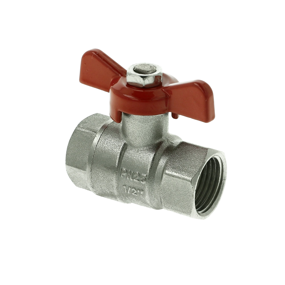 Kugelhahn mit beidseitigem Innengewinde für Wasserversorgungs-, Heizungs- oder Klimaanlagen. Der Flügelgriff besteht aus Aluminium.