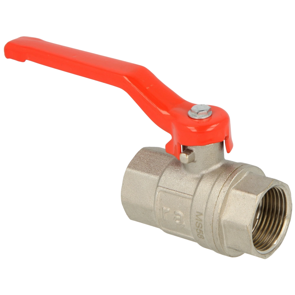 Kugelhahn für Wasserversorgungs-, Heizungs- oder Klimaanlagen mit beidseitigem Innengewinde. Der rote Hebelgriff besteht aus lackiertem Stahl und der Körper aus Messing nach CW617N.