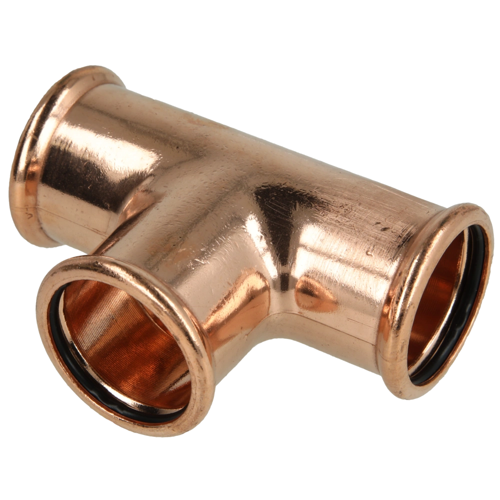 Pressfitting aus Kupfer mit Kontur M zur Verbindung von Rohren in Sanitär-, Heizungs- und Kühlsystemen.
