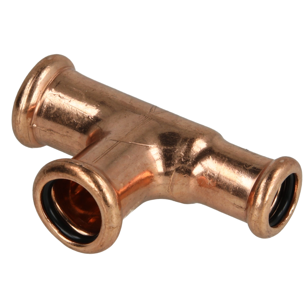 Pressfitting aus Kupfer mit Kontur M zur Verbindung von Rohren in Sanitär-, Heizungs- und Kühlsystemen.