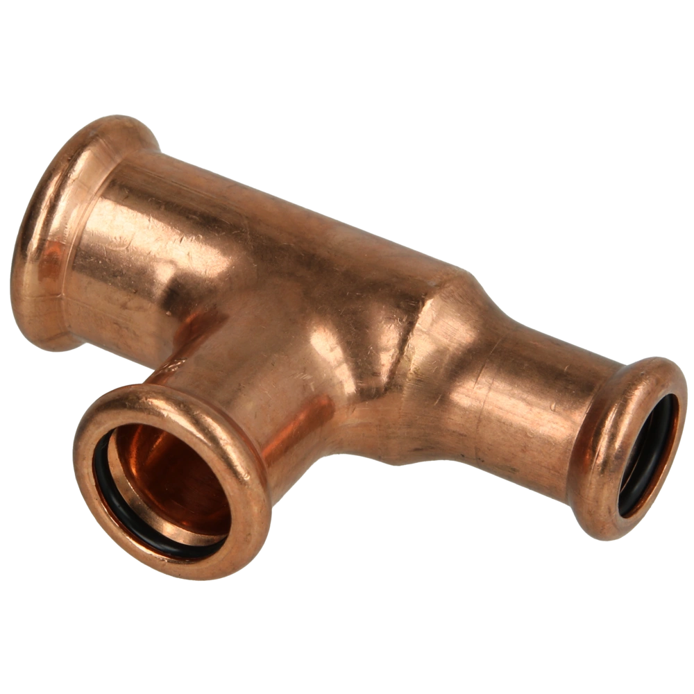 Pressfitting aus Kupfer mit Kontur M zur Verbindung von Rohren in Sanitär-, Heizungs- und Kühlsystemen.