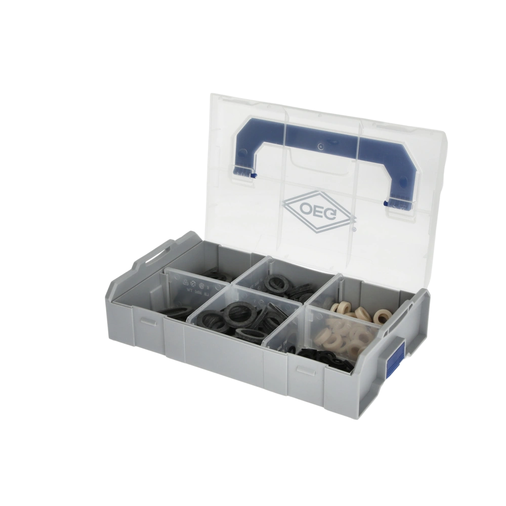 Universell einsetzbare EPDM-Gummidichtungen für den Einsatz in Öl, Wasser, Dampf, Alkohol, schwachen organischen und anorganischen Säuren in der robusten OEG L-BOXX®. Insgesamt 215 Dichtungen übersichtlich und immer griffbereit...