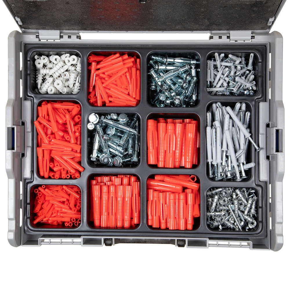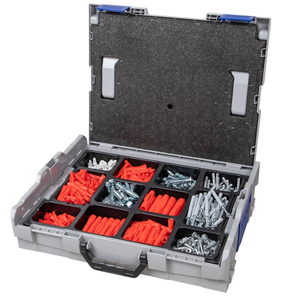 Dübelsortiment aus insgesamt 625 verschiedenen Dübeln. Übersichtlich sortiert und immer griffbereit. Die L-BOXX® ist dank des Klick-Systems stapelbar.