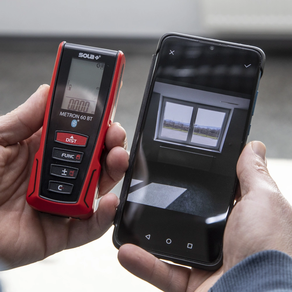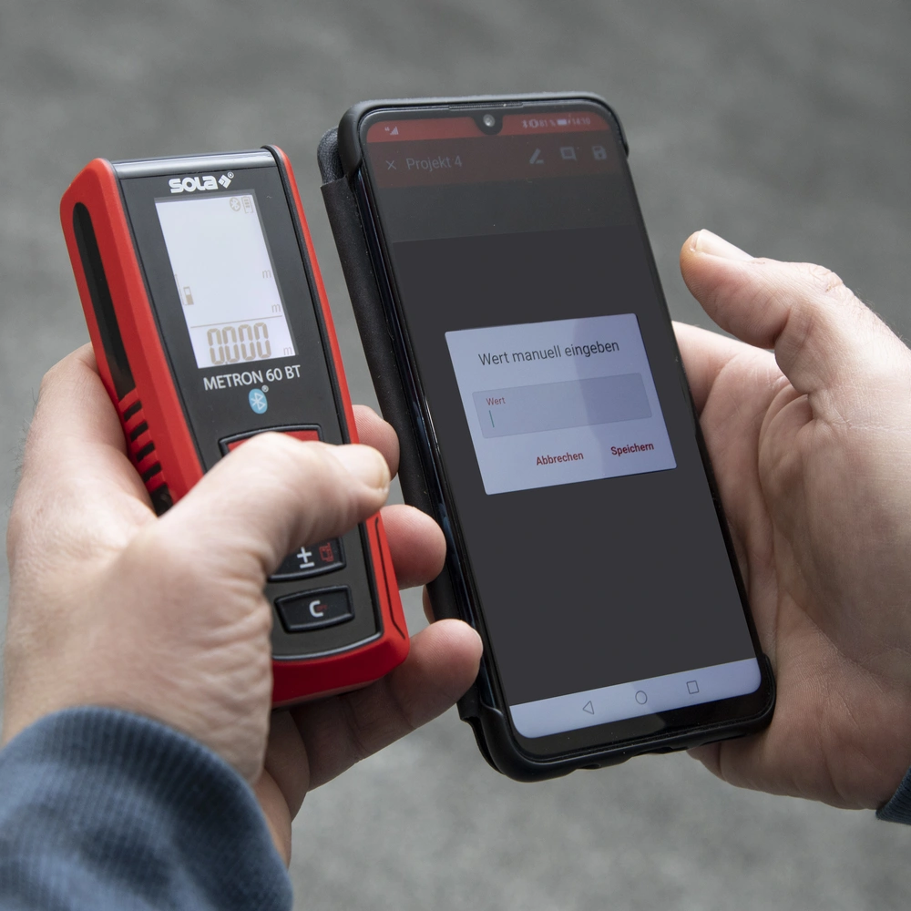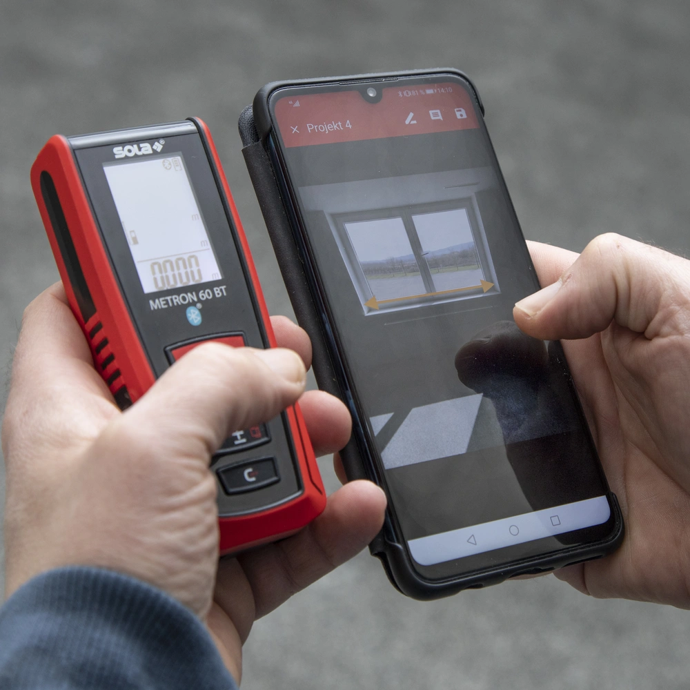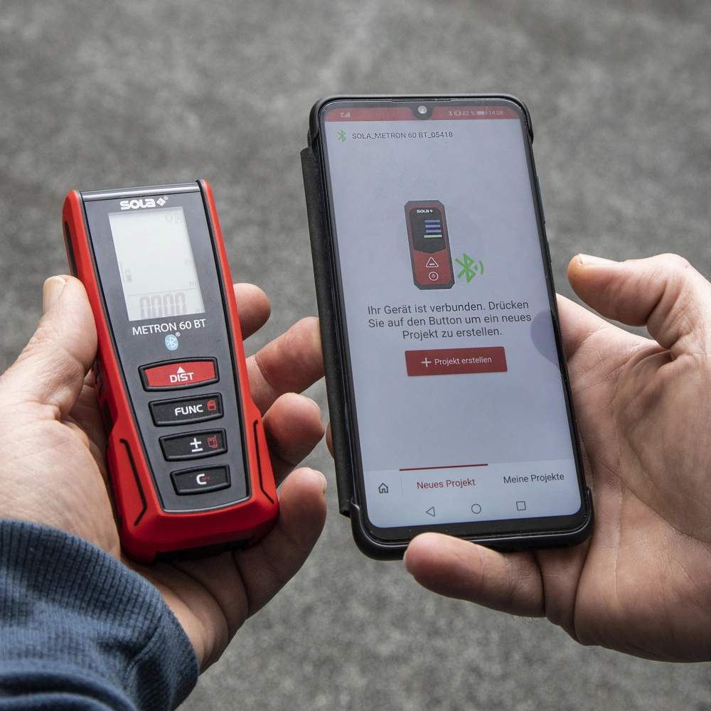 Handlicher Laser-Entfernungsmesser mit Bluetooth für schnelles und sauberes Aufmaß auf der Baustelle: Mit der kostenlosen SOLA Measures App lassen sich alle Messdaten bequem per Bluetooth auf Smartphone...