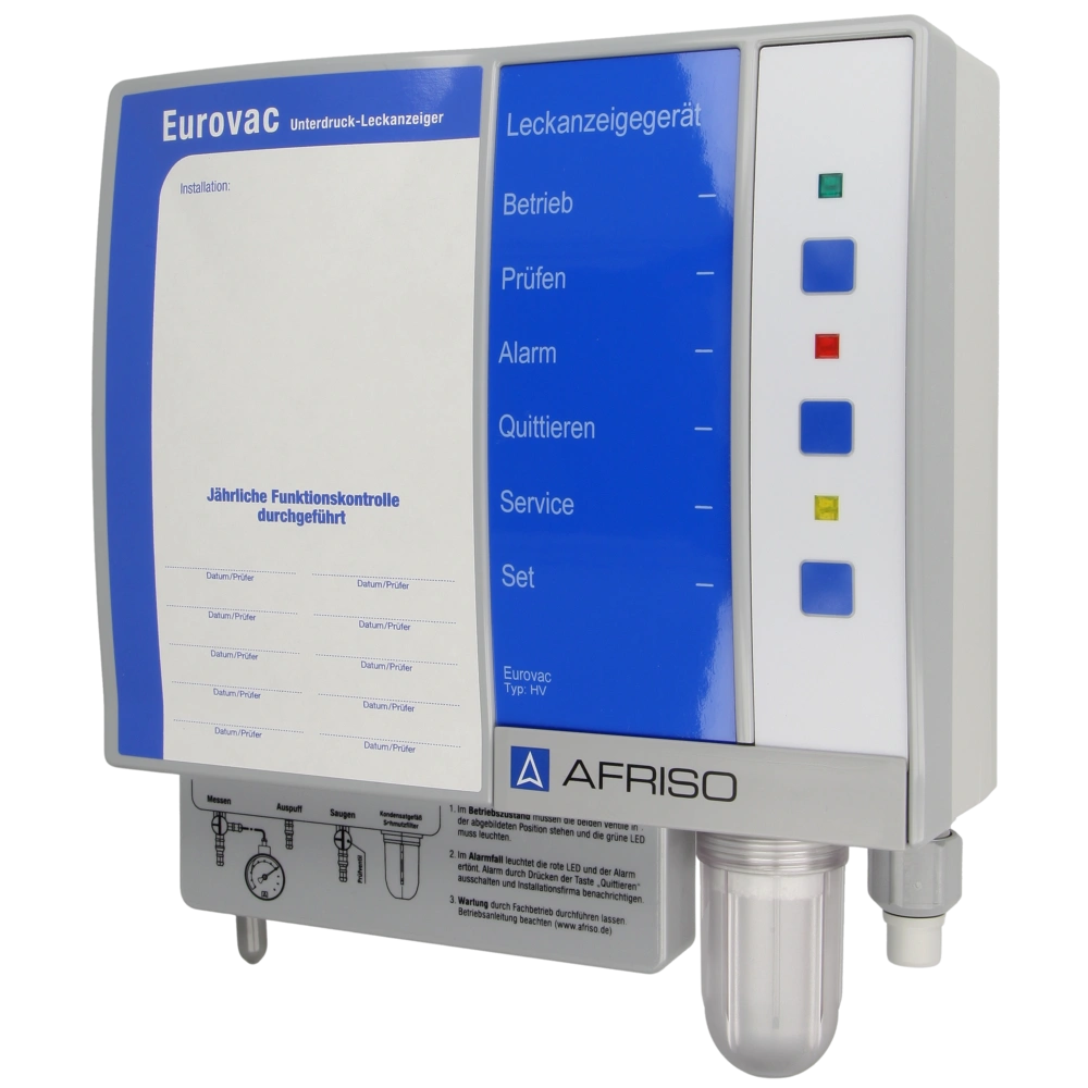Das Afriso Eurovac HV ist ein Leckanzeigegerät der Klasse I nach EN 13160 als Unterdrucksystem zur sicheren Überwachung von doppel- oder einwandigen Behältern mit Innenhüllen für die Lagerung nicht brennbarer und brennbarer Flüssigkeiten der Gefahrklasse A III (Mineralöl produkte mit Flammpunkt ≥ 55 °C) sowie AdBlue ® (Harnstoffl ösung 32,5 %) nach DIN 70070. Zudem ermöglicht Eurovac HV die Überwachungweiterer Medien (z. B. Alt- und Hydrauliköle, Schleifkühlmittel, Bremsflüssigkeit, u. v. m.). Der große Spannungsbereich (AC 100 –240 V) erlaubt einen problemlosen Einsatz in unterschiedlichen Ländern. Das Eurovac ist ein Kompaktes Leckanzeigegerät im robusten Wandaufbaugehäuse mit akustischer und optischer Alarmmeldung, der akustische Alarm kann mit der Quittiertaste beendet werden. Eurovac HV hält im Überwachungsraum des Tanks einen Unterdruck im Hochvakuumbereich. Die Vakuumpumpe wird durch einen extrem sparsamen Gleichstrommotor (Energieeffi zienzklasse A++) mit hohem Anlaufmoment angetrieben. Das Eurovac verfügt über einen Schaltausgang für Zusatzgeräte (z. B. Zusatzalarmgerät ZAG 01, Ereignismeldesystem EMS) oder zur Einbindung in Gebäudeleitsysteme. Die Pumpenlaufzeit kann abgefragt werden. Mit drei Schlauchanschlüssen (rot, weiß, grün) für die pneumatische Verbindung mit dem Überwachungsraum des Tanks. Die Anschlussstutzen sind universell für 4 mm- und 6 mm-Schläuche einsetzbar. Der Sinterkunststofffilter im Kondensatgefäß zeigt den aktuellen Verschmutzungsgrad an und kann bei Bedarf einfach und schnell von außen ausgetauscht werden. Elektrischer Anschluss von oben oder von unten. Optional kann eine 9 V-Batterie angeschlossen werden, sodass bei Netzausfall Alarm aus gelöst wird.