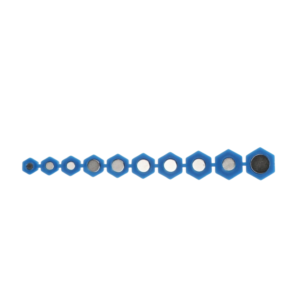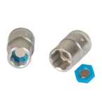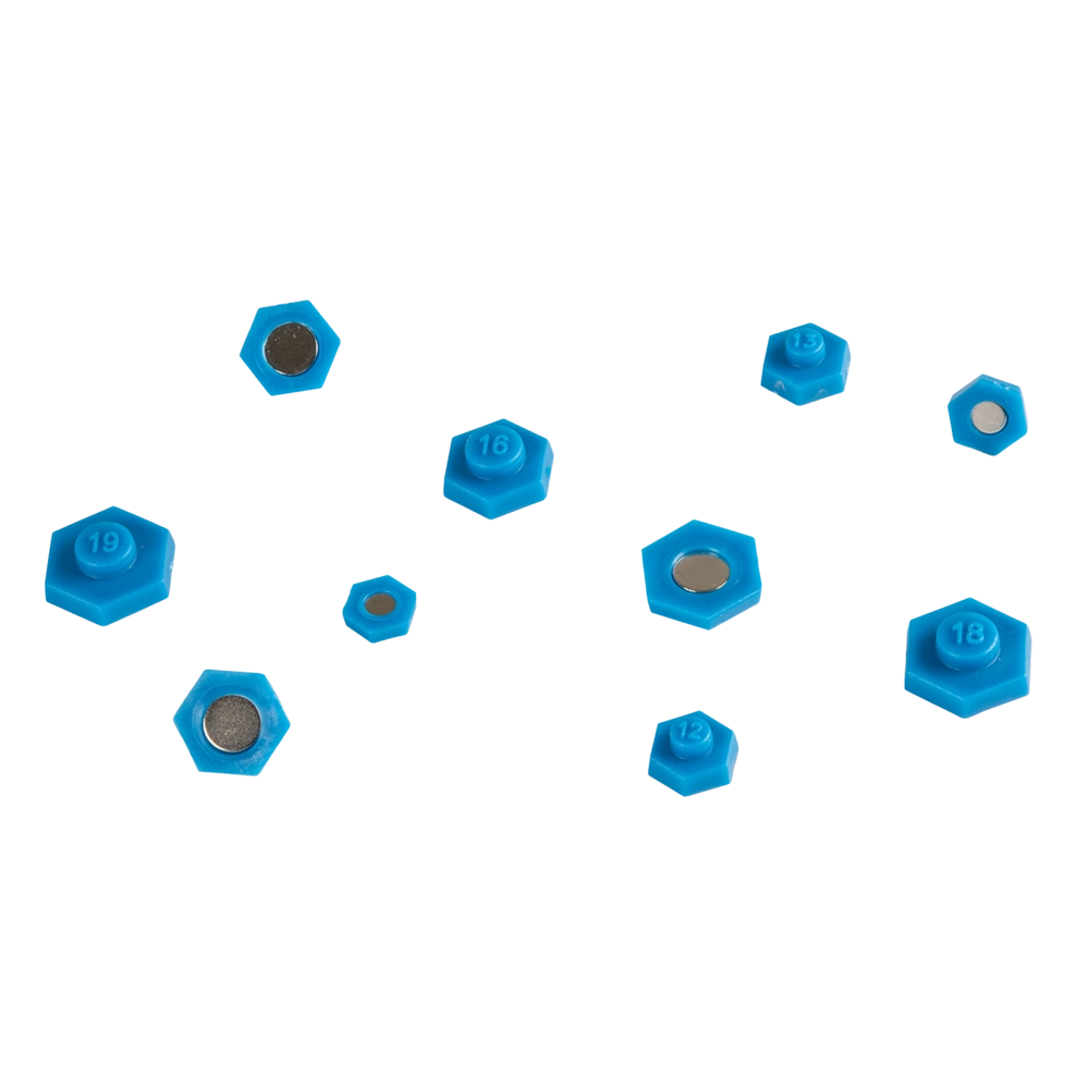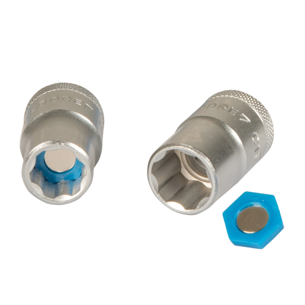 Magnetische Einsätze für genormte Steckschlüssel. Die Einsätze werden in den Steckschlüssel eingelegt und halten die Muttern oder Schrauben magnetisch fest.