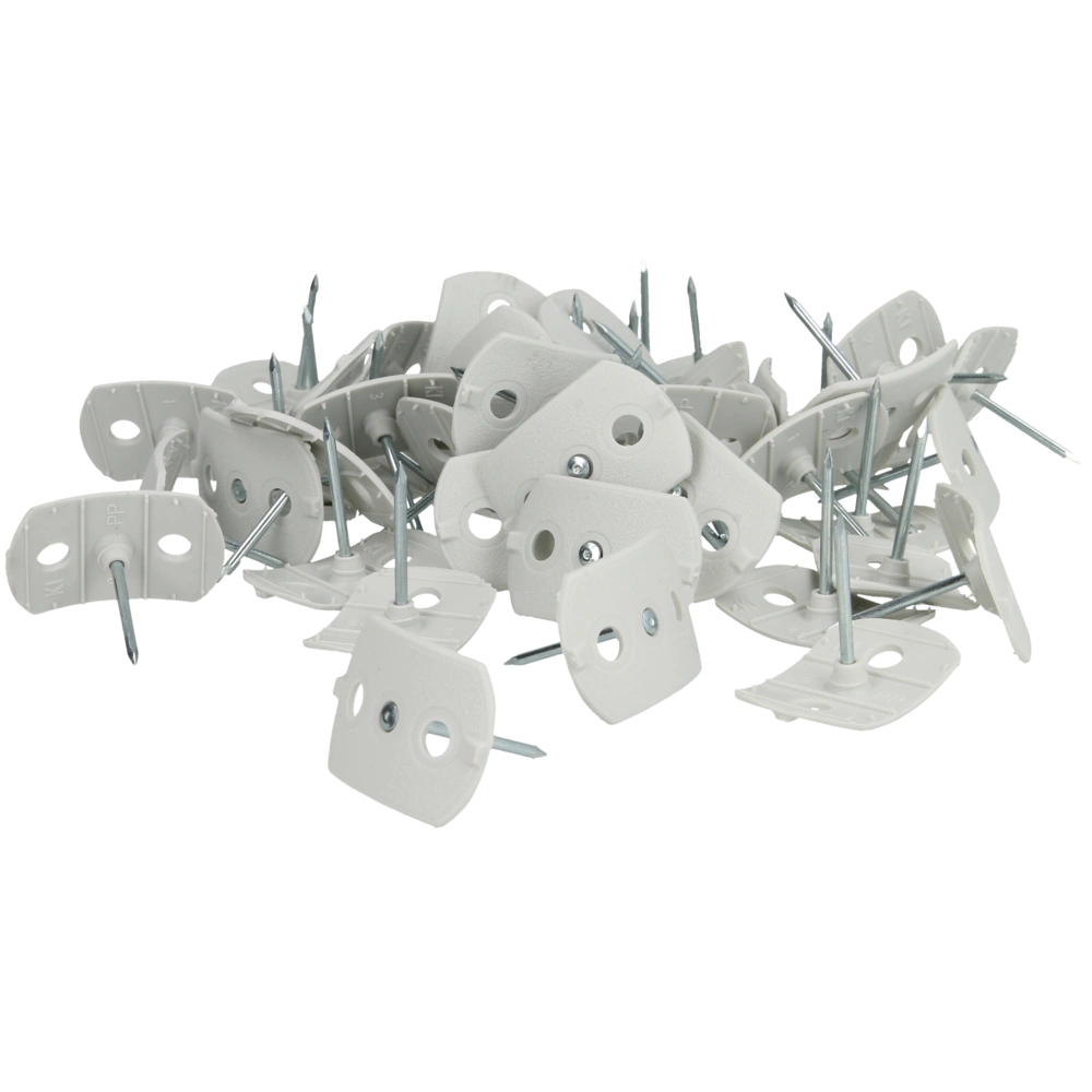 Nagelscheiben mit gehärtetem und verzinktem Stahlnagel zur Fixierung von Leitungen in Schlitzen und Vertiefungen.