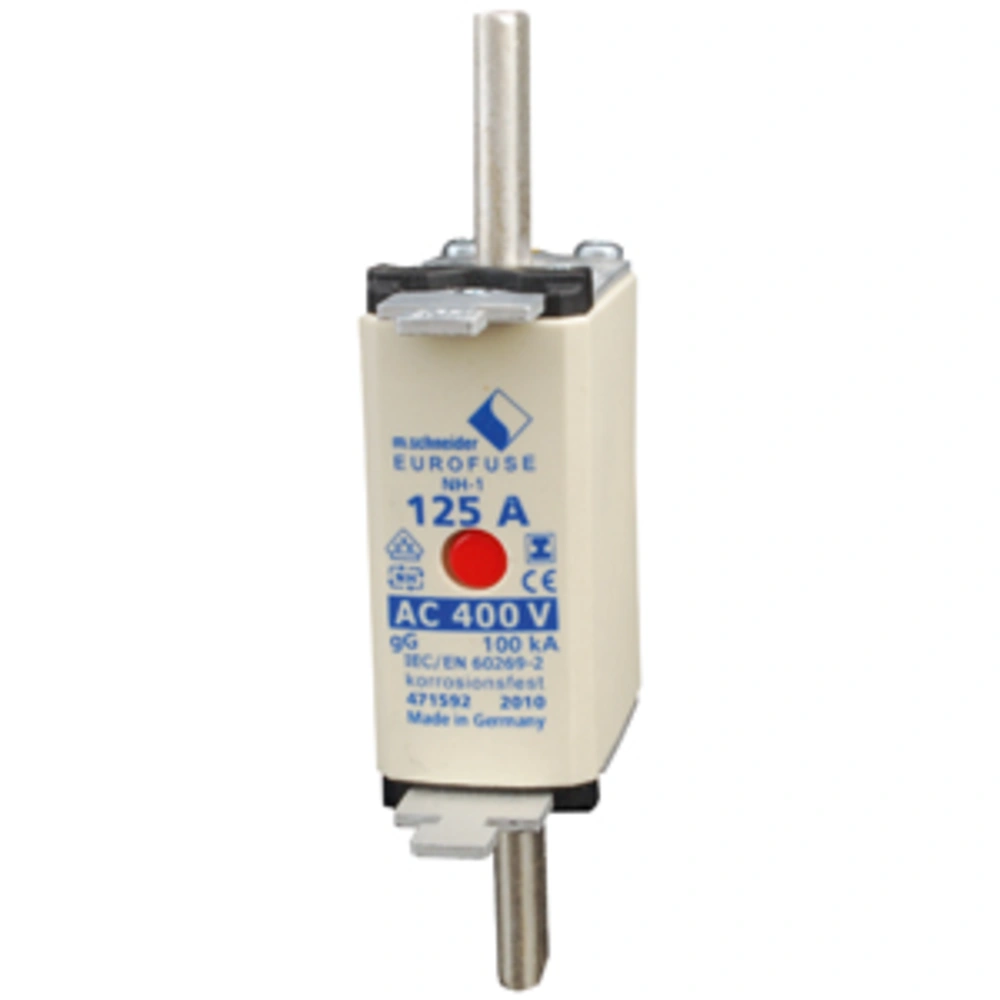 Alle ProduktinformationenNH-Sicherungseinsatz mit spannungsfreien Metallgrifflaschen zum Schutz von Leitungen, Geräten und Anlagen. Der Einsatz schaltet unzulässige Überströme und Kurzschlussströme bis zum Bemessungsausschaltstrom sicher ab.