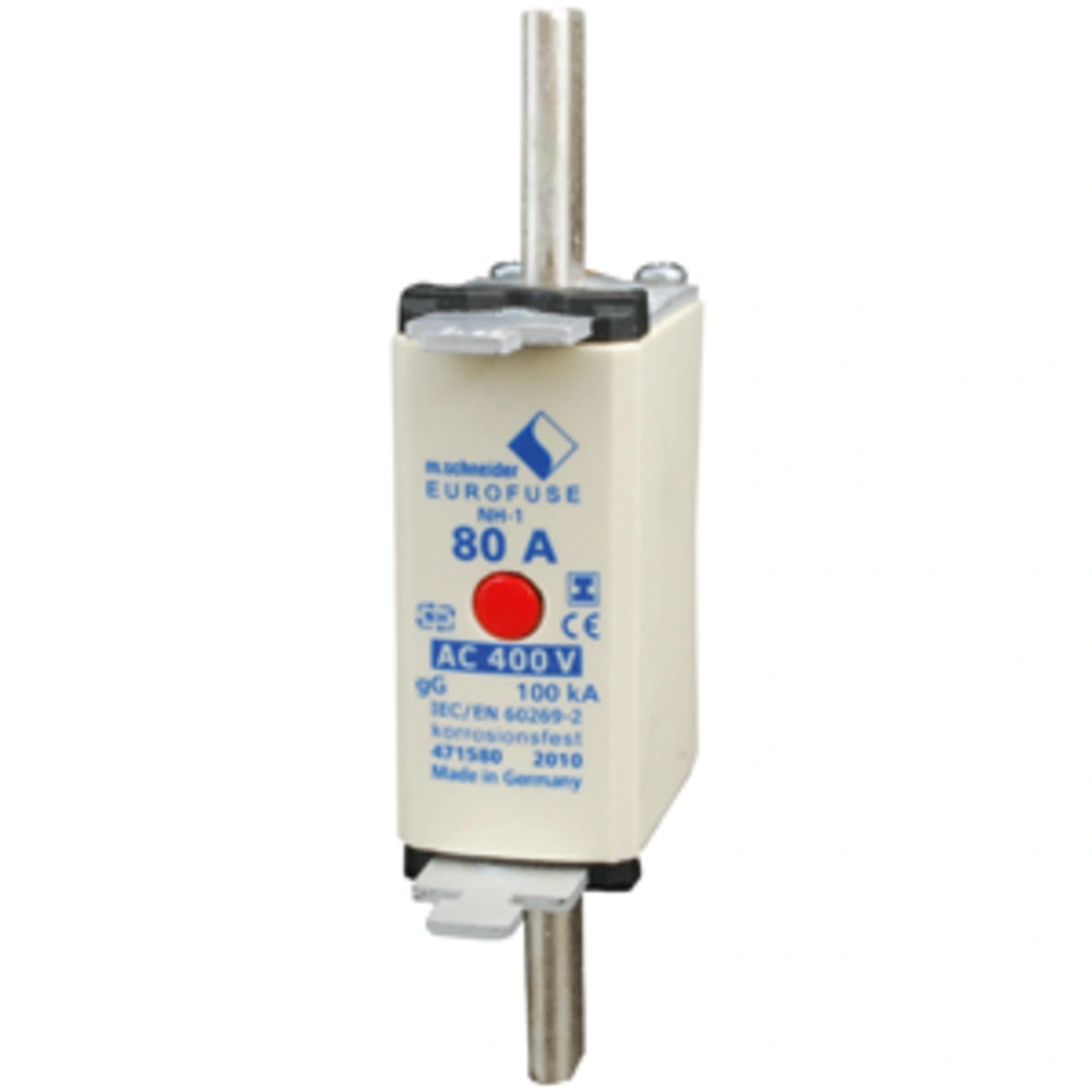 NH-Sicherungseinsatz mit spannungsfreien Metallgrifflaschen zum Schutz von Leitungen, Geräten und Anlagen. Der Einsatz schaltet unzulässige Überströme und Kurzschlussströme bis zum Bemessungsausschaltstrom sicher ab.
