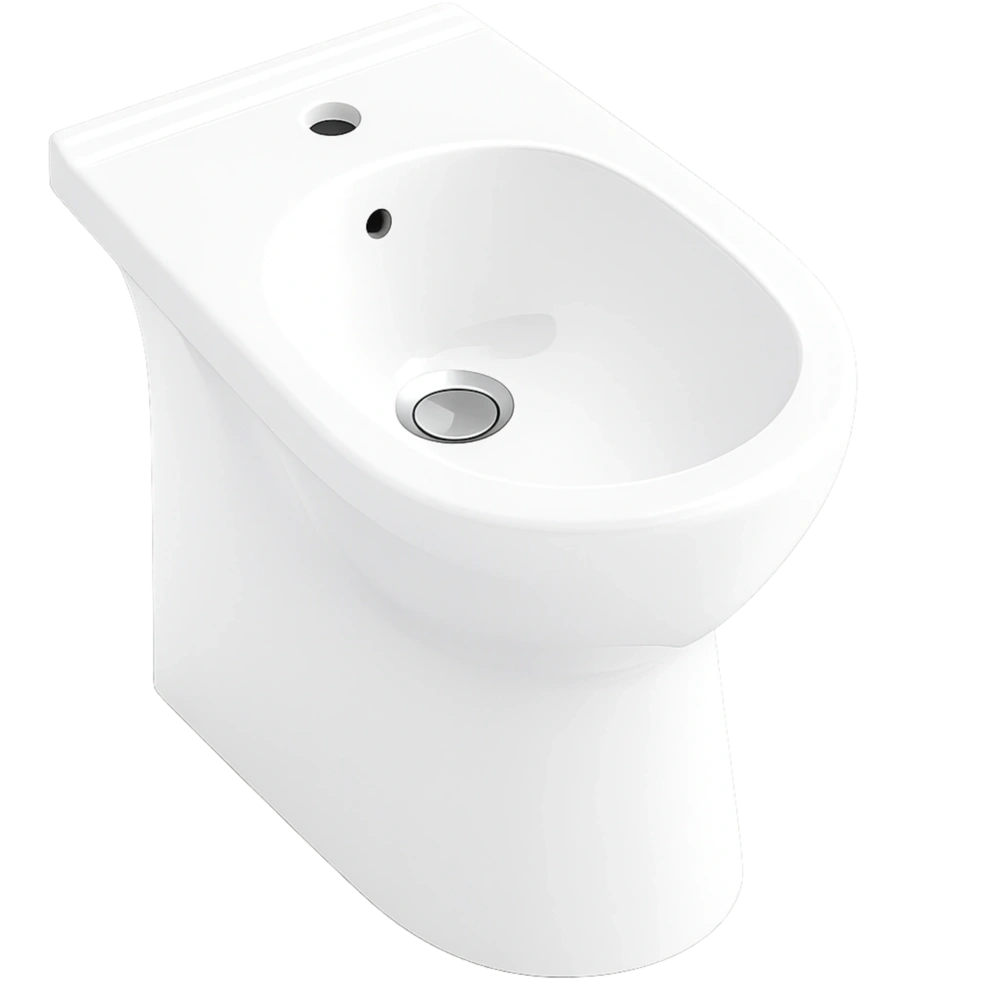 Stand-Bidet mit Überlauf und mittig durchgestochenem Hahnloch für 1-Loch-Armaturen. Das Bidet wird inklusive Befestigungssatz für eine verdeckte Montage geliefert. Die glänzende Sanitärkeramik ist pflegeleicht und langlebig.