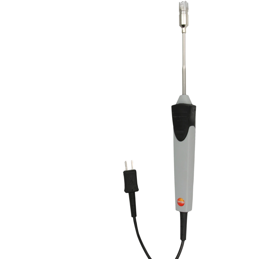 Sehr reaktionsschneller Oberflächenfühler Typ K mit federndem Thermoelement-Band und fest angeschlossenem Kabel. Der Fühler für Messgeräte mit Thermoelementestecker ist auch für nicht plane Oberflächen geeignet.