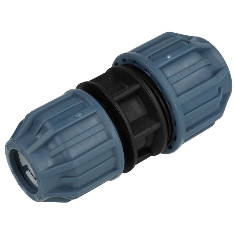 PE-Klemm-Kupplungsstück zum beidseitigen Klemmen von PE-Rohren mit unterschiedlichen Durchmessern.