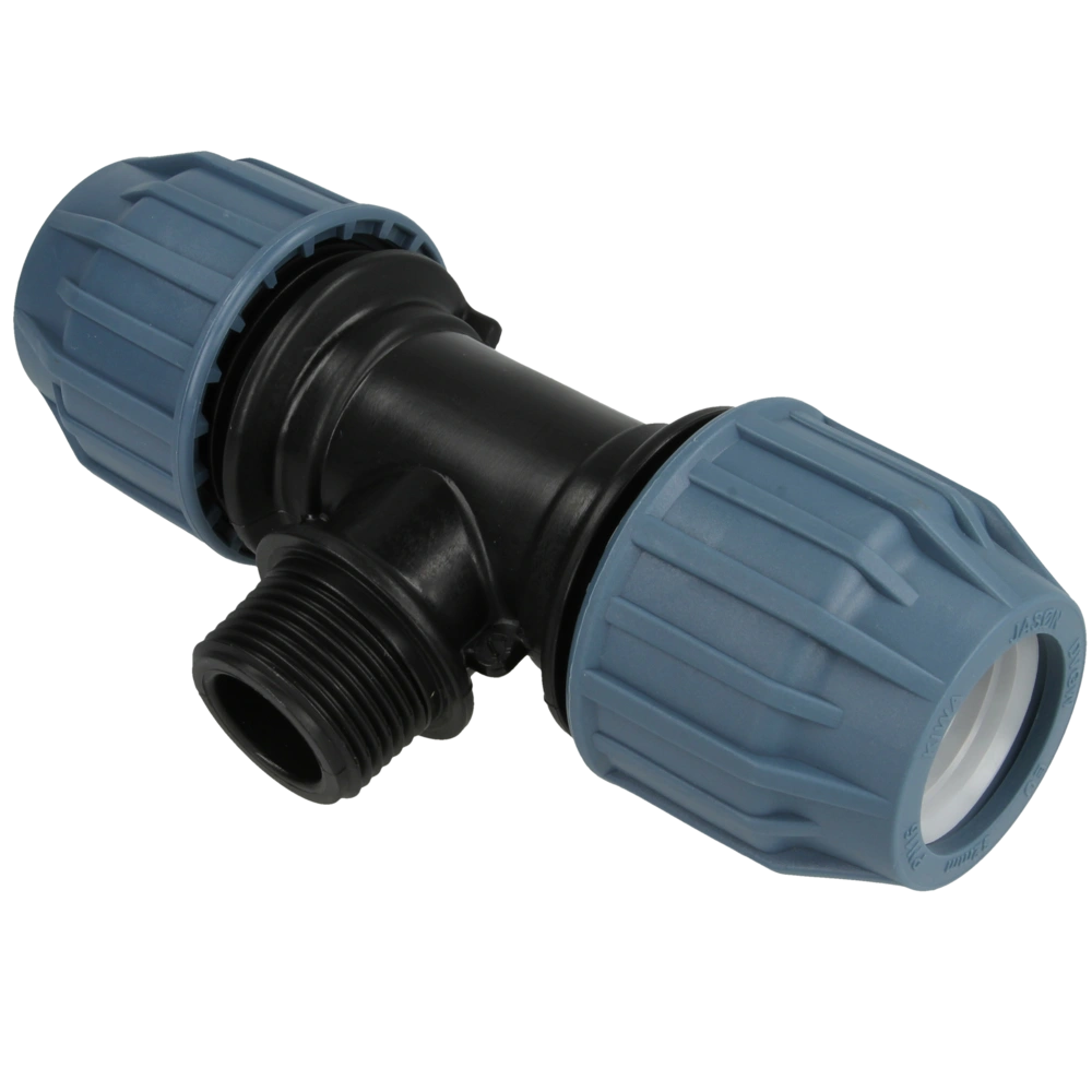 PE-Klemm-T-Stück mit 2-seitigem Klemmanschluss und einem Anschluss mit Außengewinde zum Verbinden von PE-Rohren.