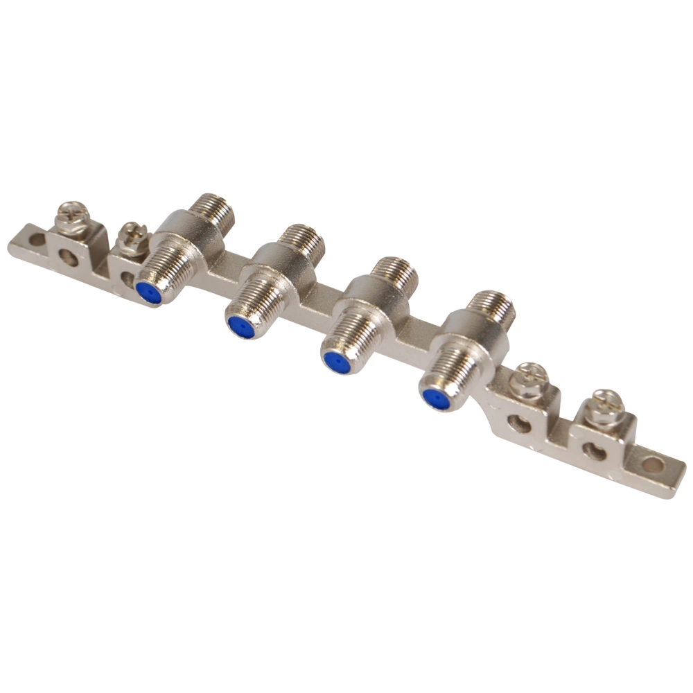 Potentialausgleichs-Block mit Befestigungsschrauben zur Aufnahme von 4 F-Doppelkupplungen.