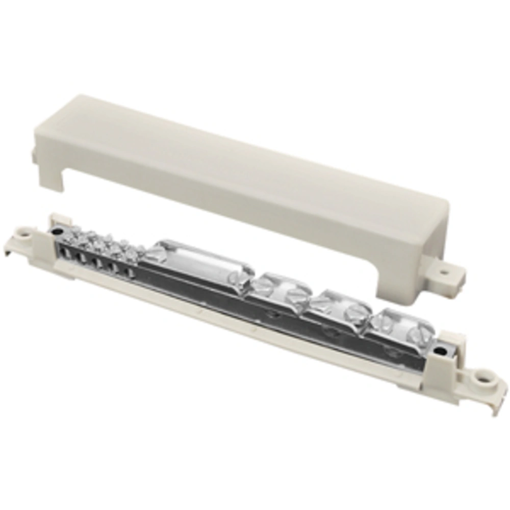 Potentialausgleichschiene mit Klemmschiene aus vernickeltem Messing, gekennzeichneten Anschlüssen und plombierbarer Kunststoff-Abdeckung.