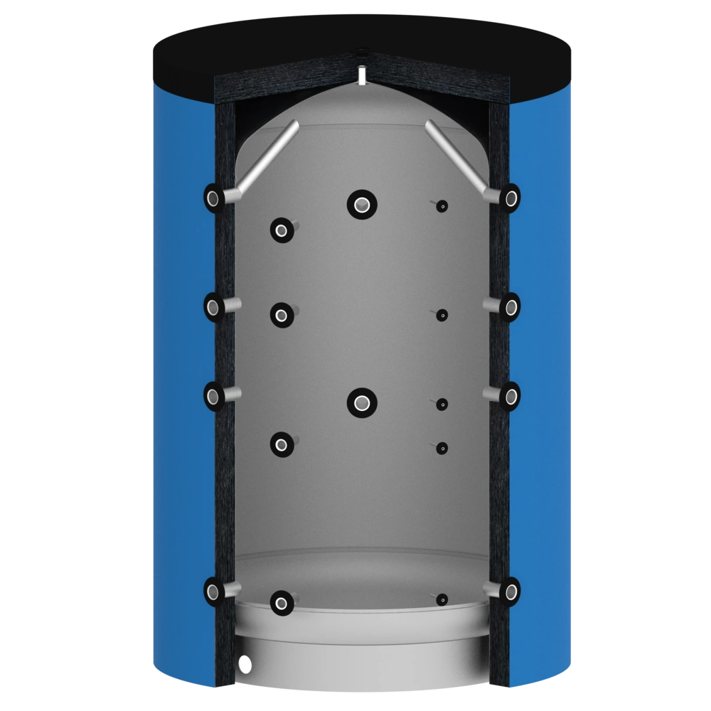 Premium Pufferspeicher für höchste Ansprüche an eine Wärmespeicherung und Effizienz. Durch seine hocheffiziente Isolierung ist der Warmhalteverlust im Vergleich zu handelsüblichen Speichern deutlich reduziert. Aufgabe des Pufferspeichers ist es eine Differenz zwischen erzeugter und verbrauchter Wärme auszugleichen. Auf diese Weise können die Wärmeerzeuger unabhängiger vom Verbrauch betrieben werden.
