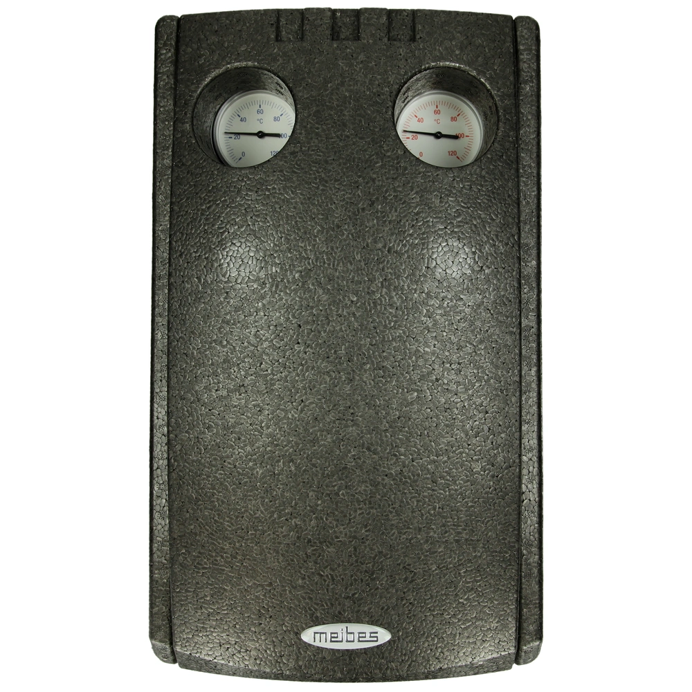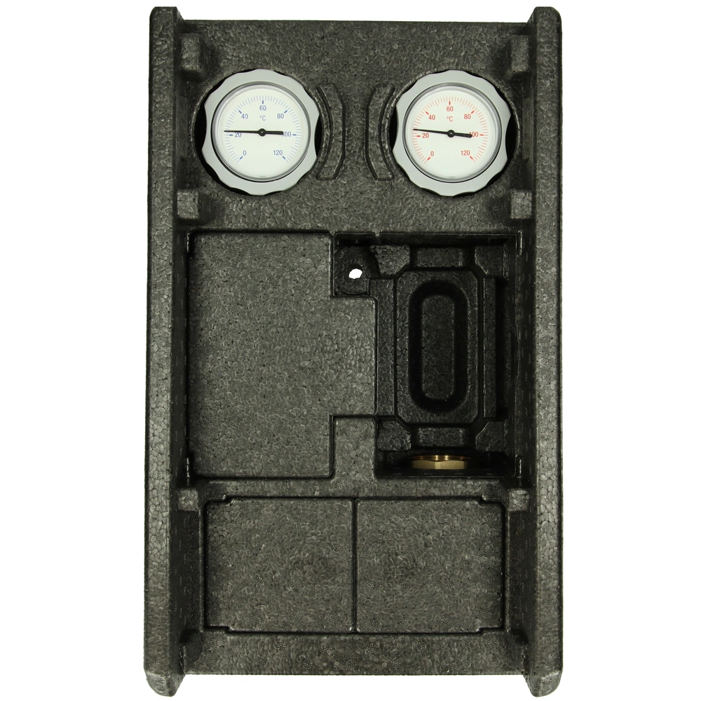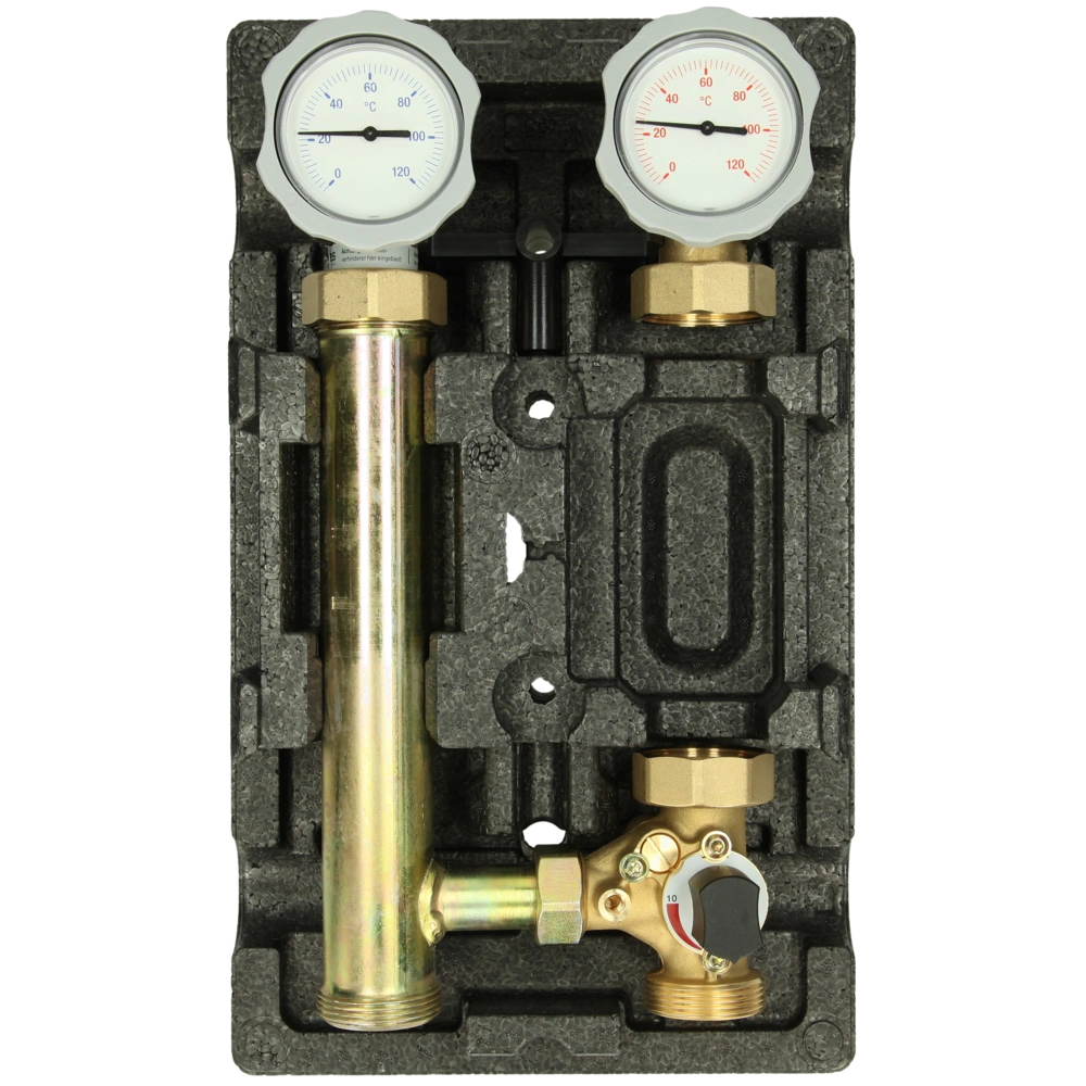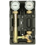 Die Pumpengruppe verfügt über einen Drei-Wege-T-Mischer mit stufenlosem Bypass. Rücklaufseitig ist eine handaufstellbare Schwerkraftbremse integriert. Es können Umwälzpumpen mit Baulänge 180 mm und 1 1/2" Anschluß verwendet werden.
