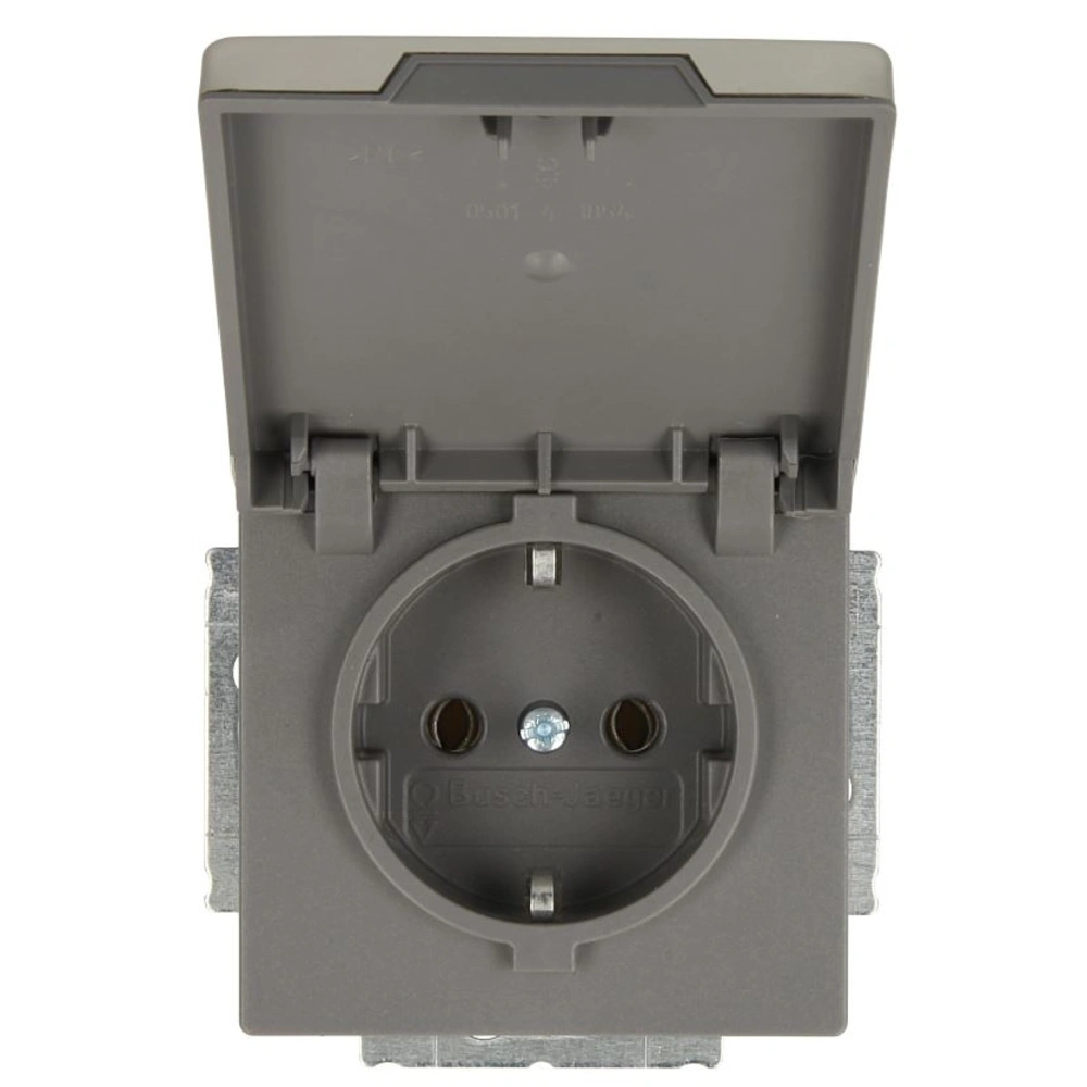 2-poliger Schutzkontakt-Steckdoseneinsatz mit arretierbarem Klappdeckel und Steckanschluss für die Unterputz-Installation.