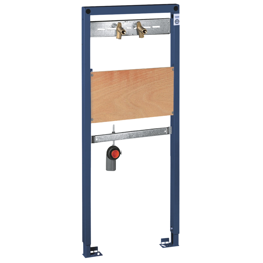 Einbauelement für Vorwand- oder Ständermontage von Ausgüssen. Der vormontierte Stahlrahmen mit wasserfester Schichtholzplatte, Schnellverstellung und Höhensicherung ist für Wandbatterien vorbereitet und TÜV-geprüft.
