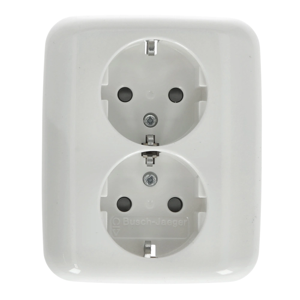 2-polige Schutzkontakt-Doppelsteckdose mit erhöhtem Berührungsschutz, Vollplatte und Steckanschluss für die vertikale Unterputz-Installation.