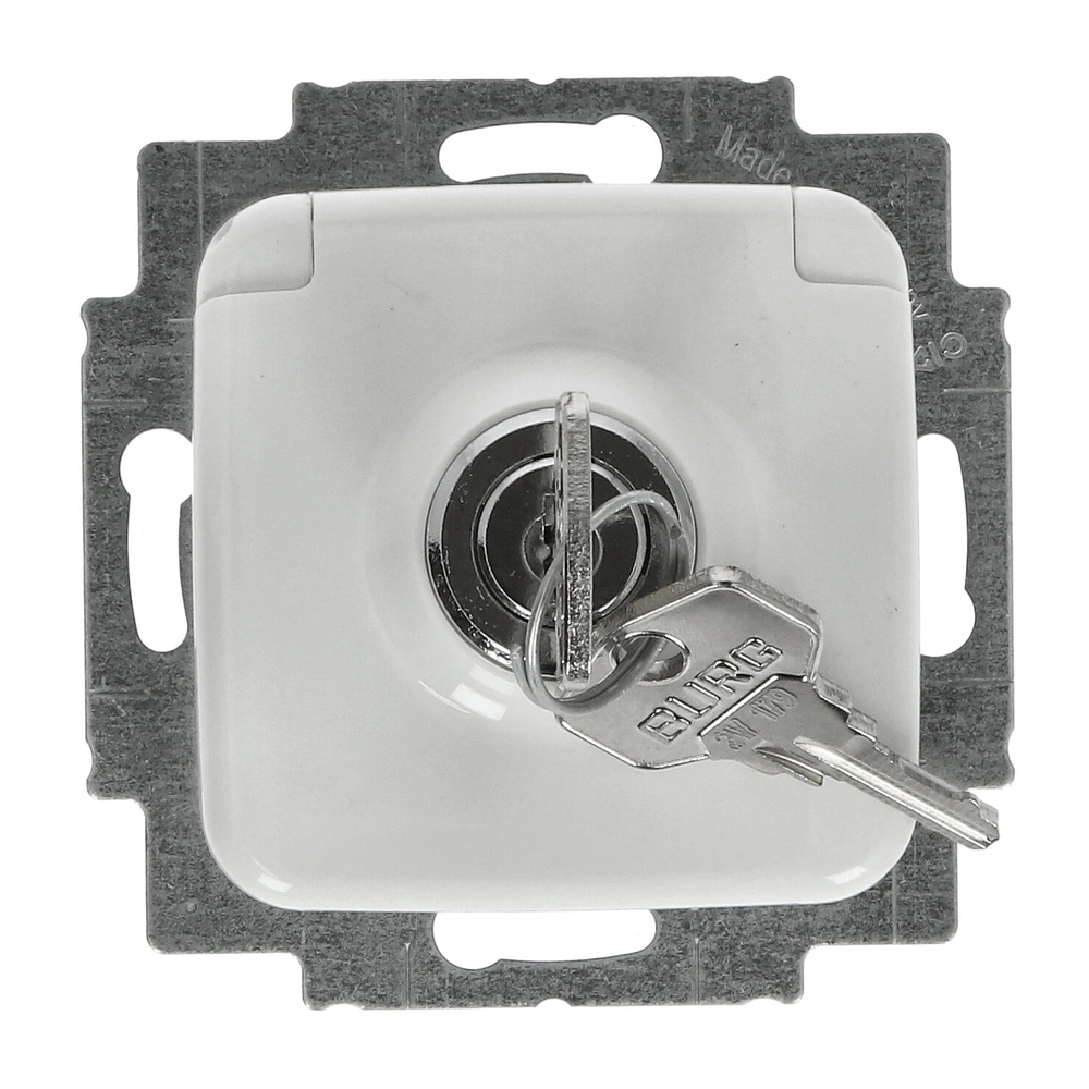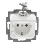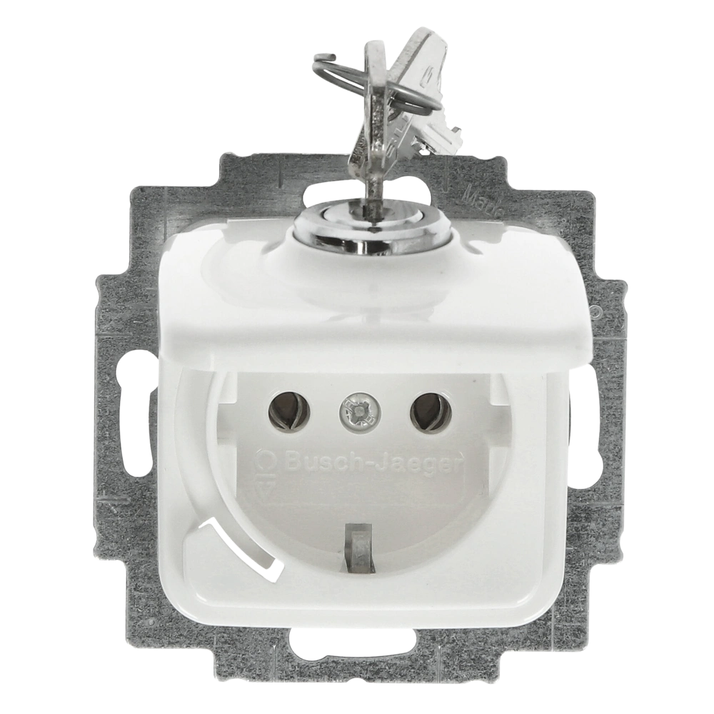2-poliger Schutzkontakt-Steckdoseneinsatz mit abschließbarem Klappdeckel und Steckanschluss für die Unterputz-Installation.
