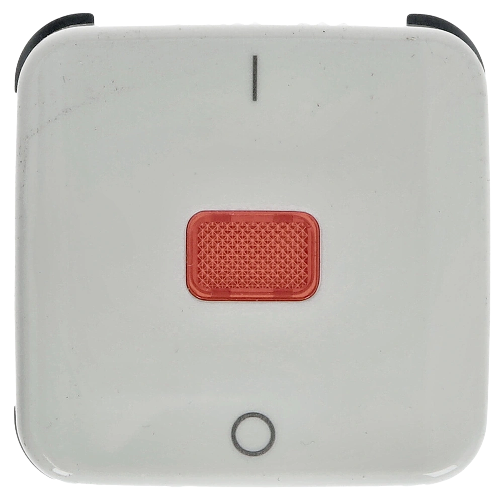 Einzelwippe mit kleiner, roter Kalotte und Aufdruck "0" und "I" als Abdeckung für 2- und 3-polige Ausschalter zur Unterputz-Installation.
