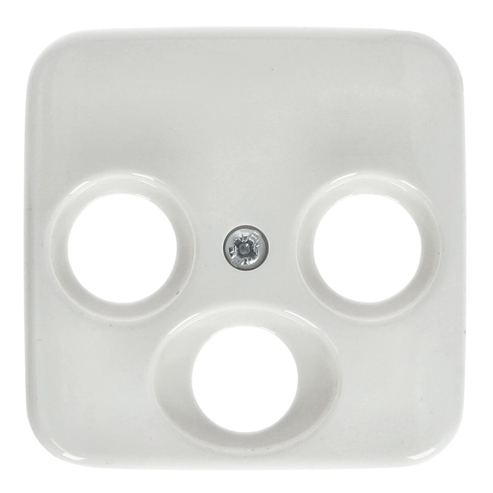 Zentralscheibe mit drei Anschlüssen und zentraler Befestigung als Abdeckung für Antennensteckdosen Radio/TV/SAT zur Unterputz-Installation.
