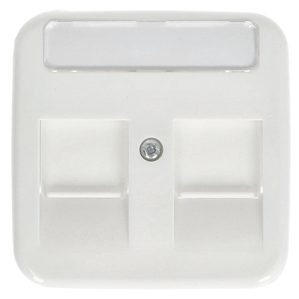 Zentralscheibe mit 2 Modular-Jack-Einsätzen inkl. Öffnungsschieber und Beschriftungsfeld als Abdeckung für Netzwerkdosen zur Unterputz-Installation.