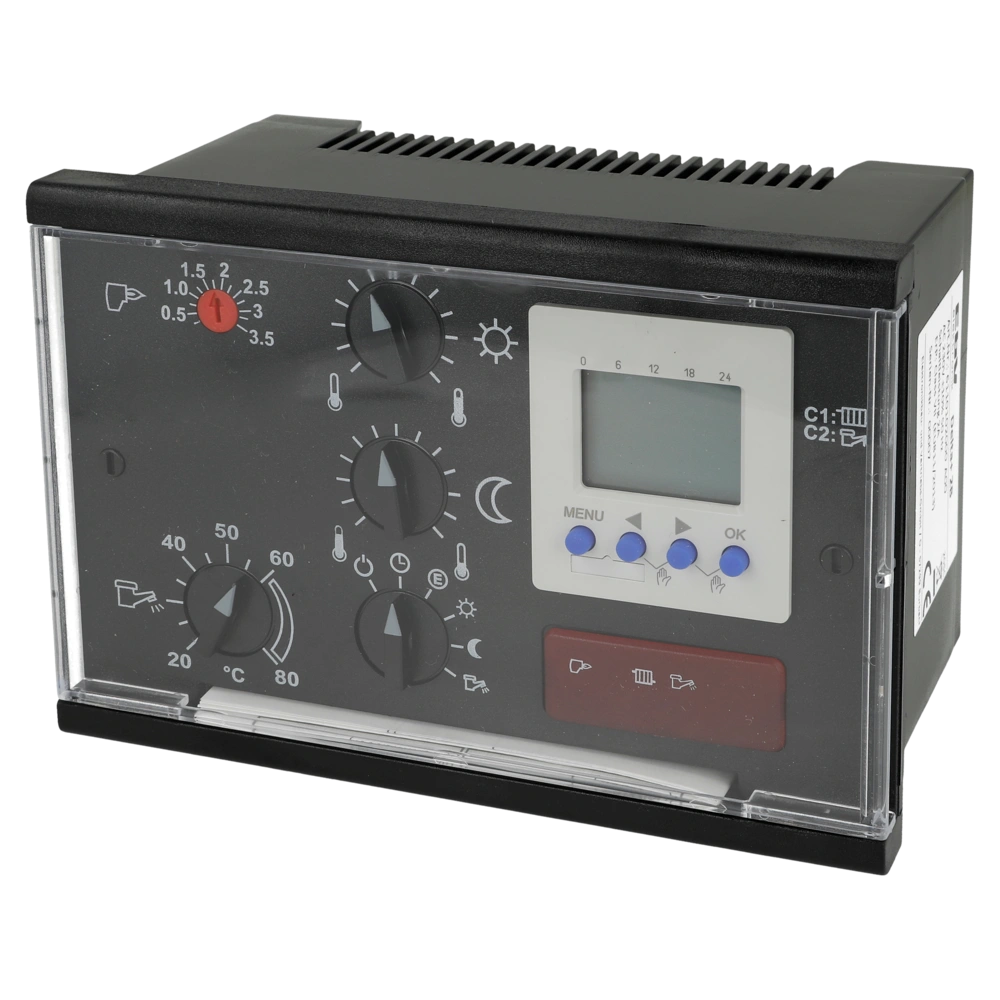 Analoger witterungsgeführter Kesselregler für Schaltfeldeinbau. Der Regler steuert 1-stufige Kessel, Heizungs-Umwälzpumpen und die Warmwasserbereitung. Die Bedienung über einen Drehschalter für alle wesentlichen Funktionen ist sehr einfach und intuitiv. Die 2-Kanal-Digitalschaltuhr ermöglicht getrennte Heizungs- und Warmwasserzeiten.